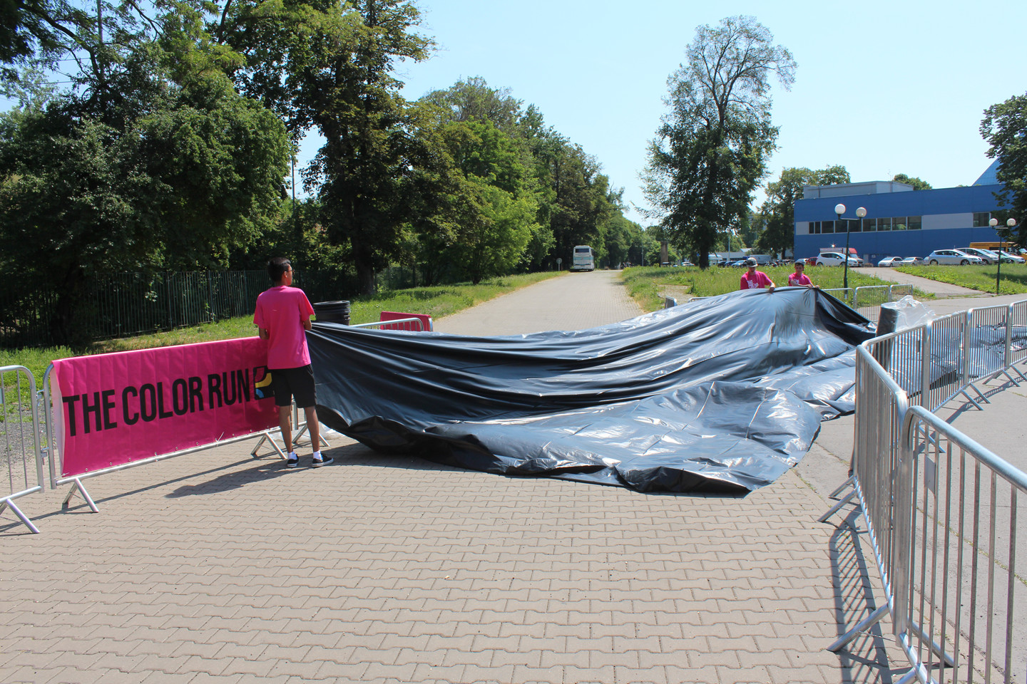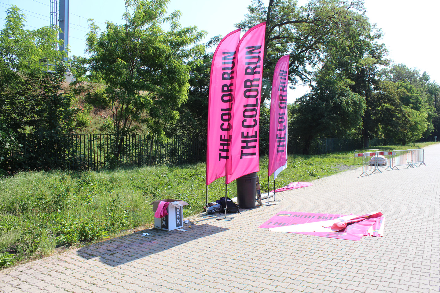 Pak jsme se odebrali na místo, kde jsme měli za úkol postavit svou zastávku. I když mám jinak spíš tragickou prostorovou představivost, ukázalo se, že dát dohromady pár zábran s bannery a beach flagy a natáhnout mezi nima igelit nebude zase tak těžký, zvlášť, když na to máte nějakých pět hodin.
