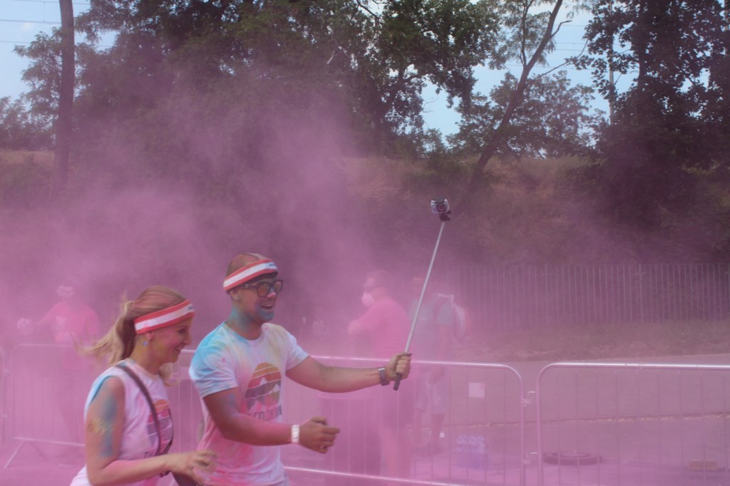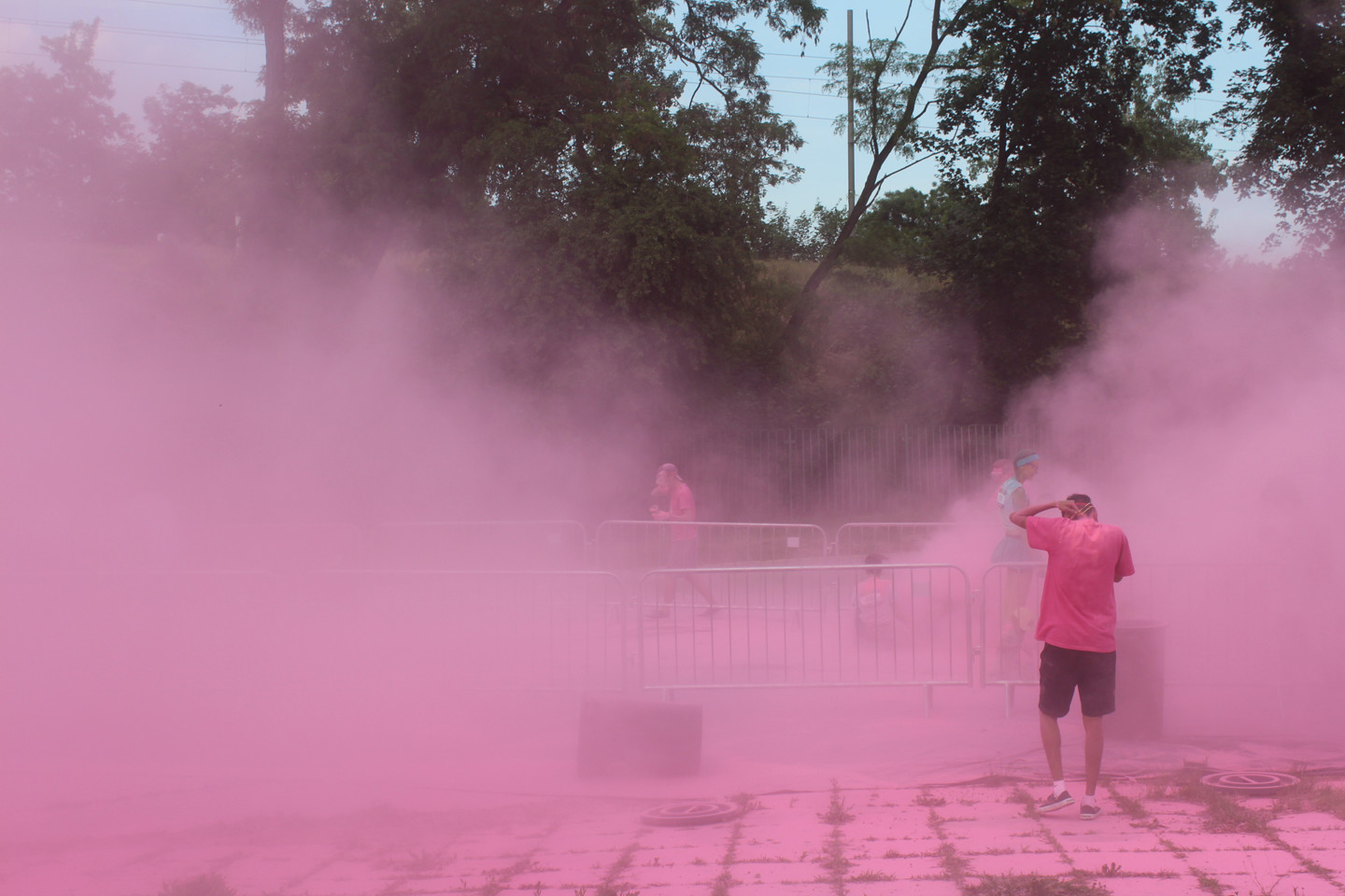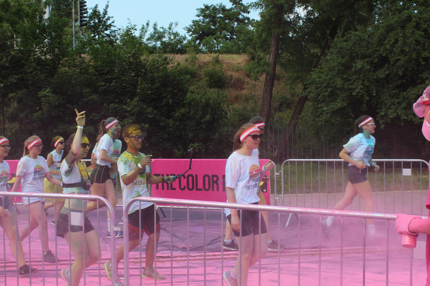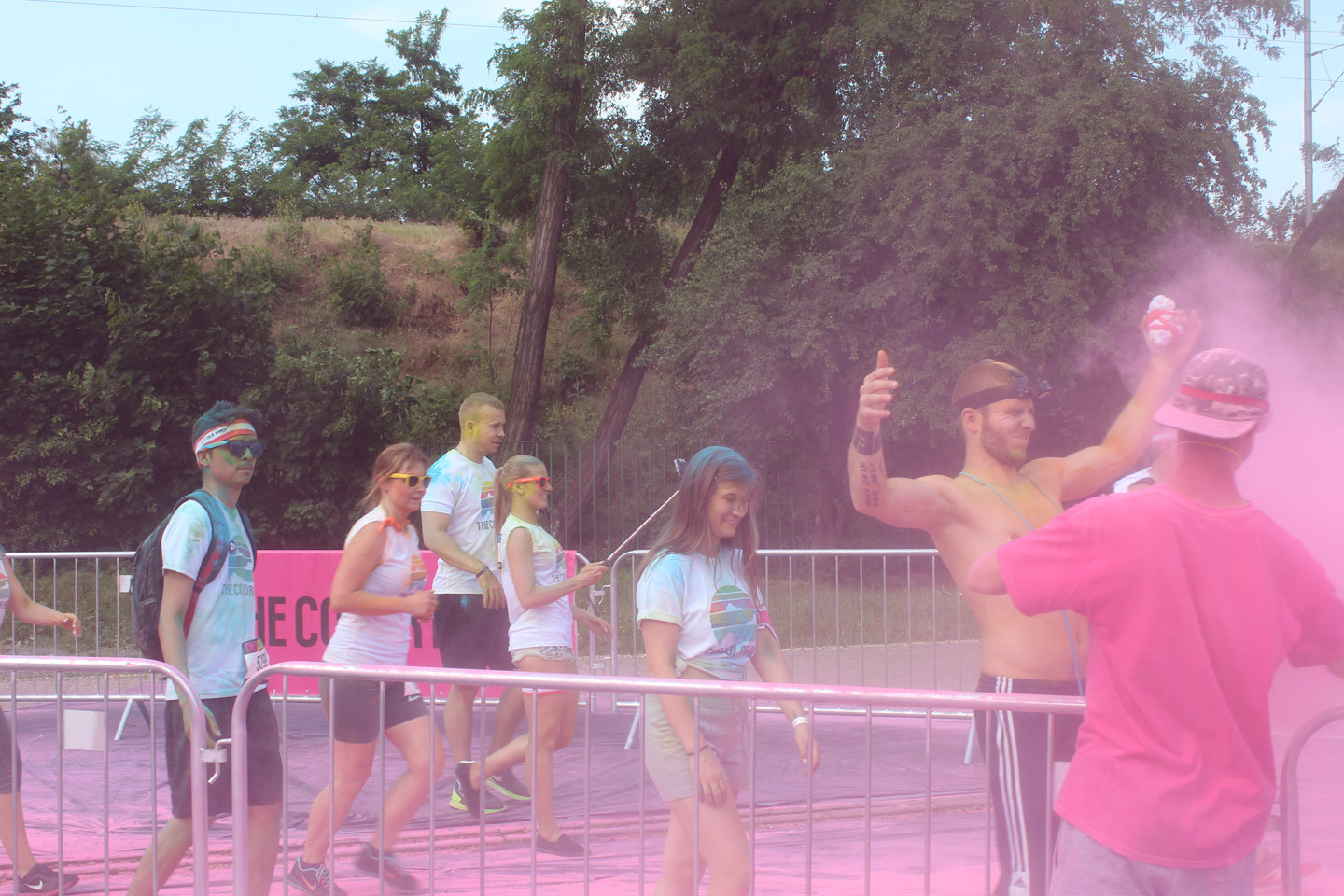 Růžová byla poslední barvou před cílem. Marie s předstihem do vysílačky hlásila, kde se desetitisícový dav lidí, kteří zaplatili sedm stovek za to, aby po nich středoškoláci házeli barvu, nachází. Jako první k nám přiběhli běžci, kteří běhají každou sobotu běh, co zrovna někdo zorganizoval a to, že na ně házíme barvy, je zjevně obtěžovalo. Pak chvilku nic a pak to přišlo. Nekonečný dav se selfie sticky, kteří si podél zábran stoupal do fronty, aby jim kluci nasypali prášek na hlavu. Představovala jsem si něco ve stylu náboženských orgií někde v Indii, ale místo toho připochodoval průvod s nerezovýma klackama držených v úhlu 45 stupňů a připomínal něco úplně jinýho. Moje představy o sobotní apokalypse byly zjevně až moc romantický.