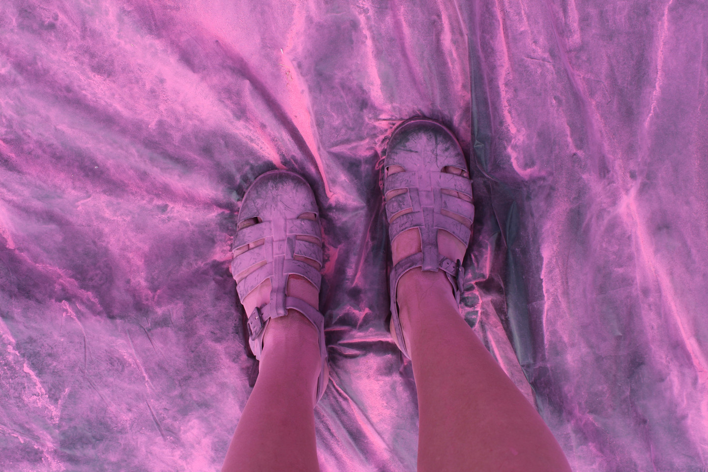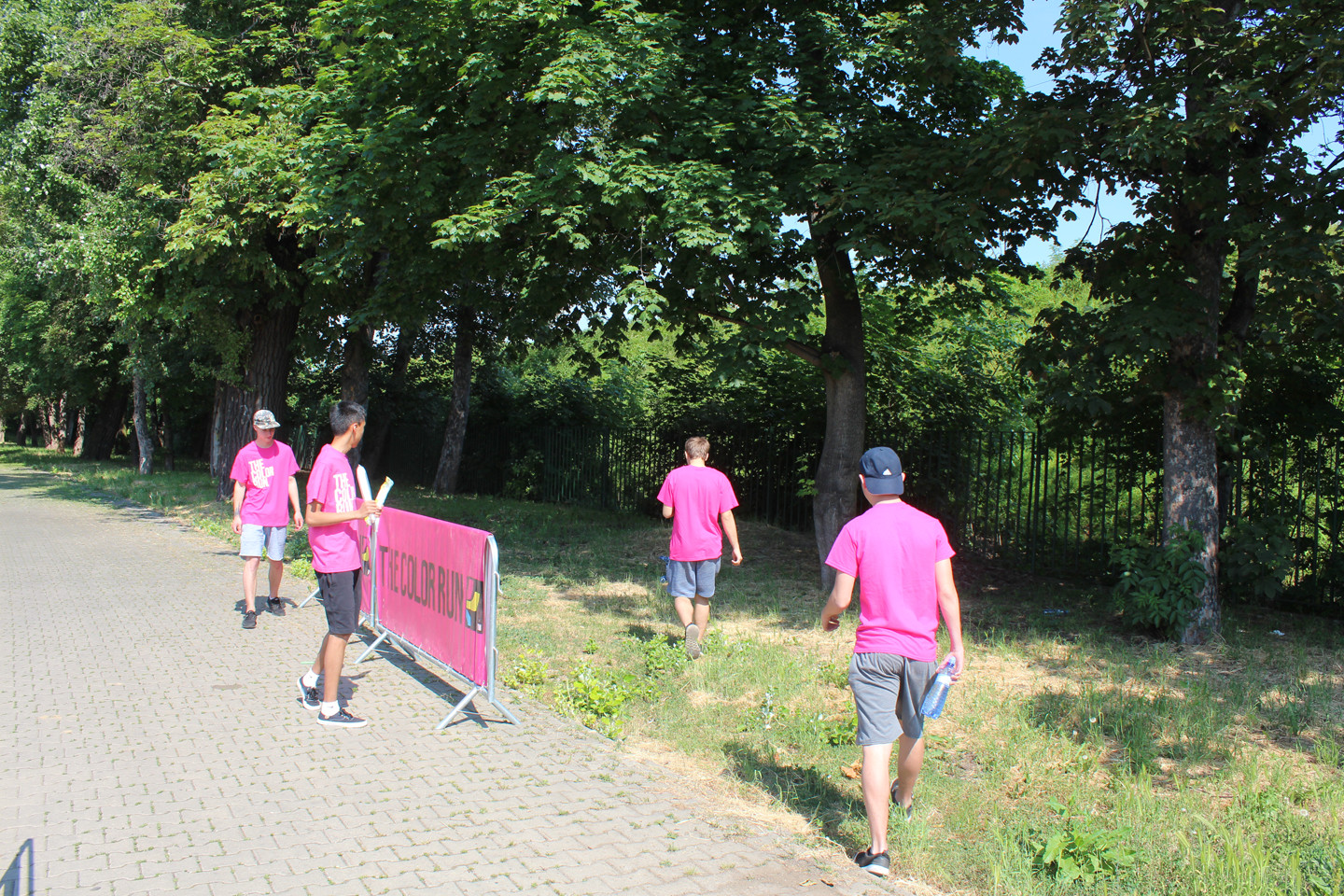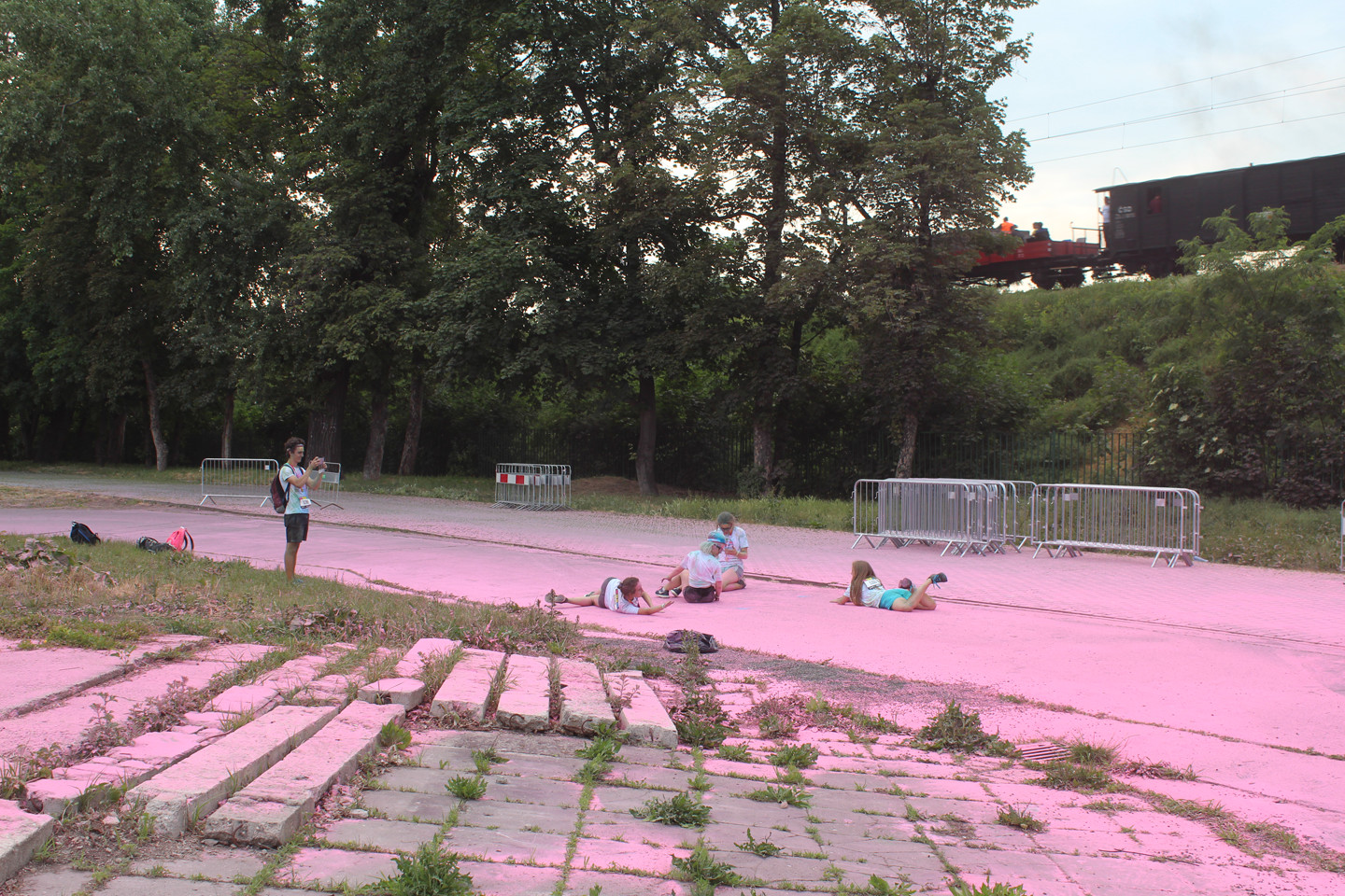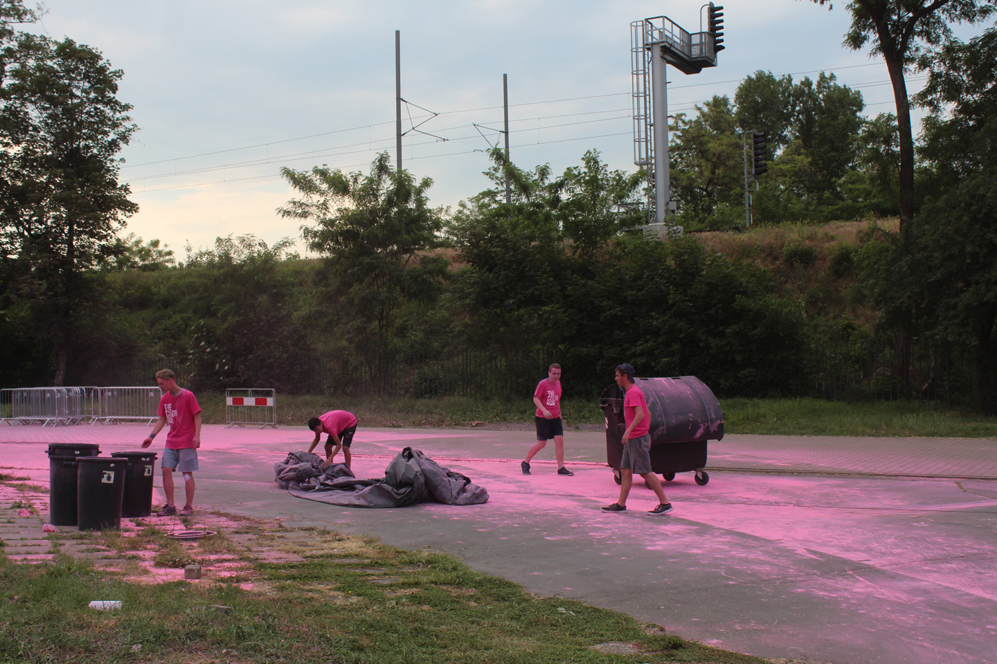 Růžová byla poslední barvou před cílem. Marie s předstihem do vysílačky hlásila, kde se desetitisícový dav lidí, kteří zaplatili sedm stovek za to, aby po nich středoškoláci házeli barvu, nachází. Jako první k nám přiběhli běžci, kteří běhají každou sobotu běh, co zrovna někdo zorganizoval a to, že na ně házíme barvy, je zjevně obtěžovalo. Pak chvilku nic a pak to přišlo. Nekonečný dav se selfie sticky, kteří si podél zábran stoupal do fronty, aby jim kluci nasypali prášek na hlavu. Představovala jsem si něco ve stylu náboženských orgií někde v Indii, ale místo toho připochodoval průvod s nerezovýma klackama držených v úhlu 45 stupňů a připomínal něco úplně jinýho. Moje představy o sobotní apokalypse byly zjevně až moc romantický.