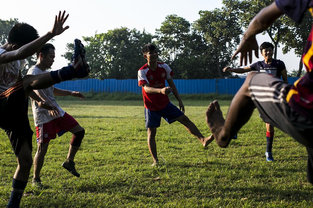 Cvičení a fotbal je začátkem každého dne „klientů” katolického Centra rehabilitace a znovuzrození na předměstí Myitkyiny.
