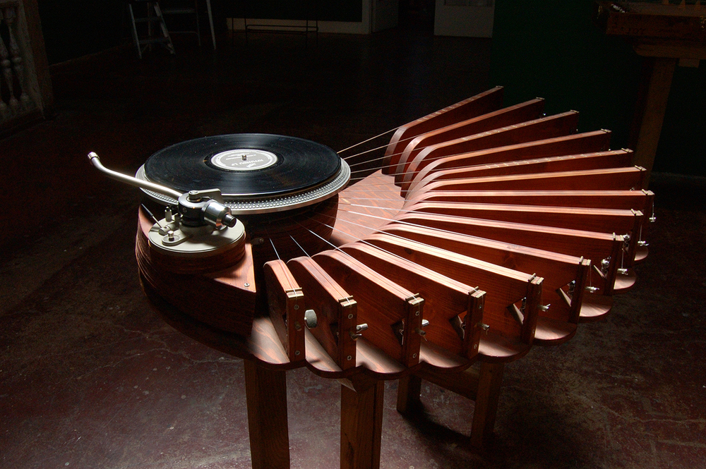 The design was informed by practical matters like the size of the turntable and the length of my arms, but the shape and style was an aesthetic decision. I just grabbed a piece of wood and drew a shape on it that felt good and went from there. The process is deeply organic and improvisatory. It mirrors building a composition. Once done, I tightened up the strings to a nice open tuning based on where each string seemed to sound the best, and then got out the tuner and wrote down the notes. That's when I learned what the nature of the instrument would be, it wasn't pre-planned. Then I had to sit down and learn how to play the thing. The blue color was available from the local store and I took a chance on it. I wish I still had that stain as it's been discontinued.It seems awfully close (but unique from) the PhonoSarangi and the Nautilus Harp. Did this instrument influence the production of others you made after?