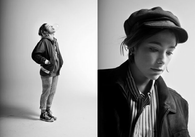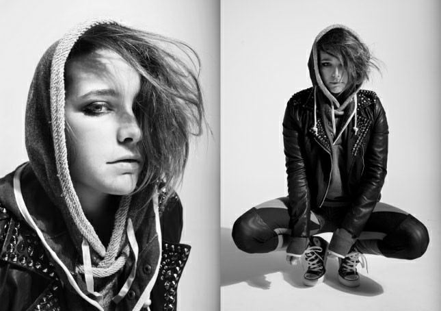 Page Left: Iconyc jacket, Converse hoodie, Obey t-shirt, Iconyc jeans, Converse shoes, Sharra Pagano earrings. Page Right: Wrangler jacket, Obey shirt and cap, Sharra Pagano earrings.