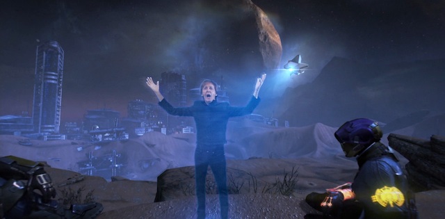 Anyway, if you’ve ever wondered what the Beatles would be like but modarn, “Hope for the Future” is your answer. And more specifically, the video for “Hope for the Future” is your answer, since it’s basically like Help (the movie) except with space tanks instead of regular tanks. By space tanks, I mean spaceships. Also, Paul McCartney is a hologram. I imagine that if you are familiar with the fictional world of Destinytown, which I assume is the name of the planet on which Destiny the game takes place, and its revolving moons Ringo and George, this video would mean a lot more to you, as you watch the guys from Halo sit down in a circle and listen to Paul McCartney sing about the future. If you are not familiar with the video game, well, here is what Paul McCartney looks like as a space hologram, which, now that I think about it, should definitely be an unlockable character: