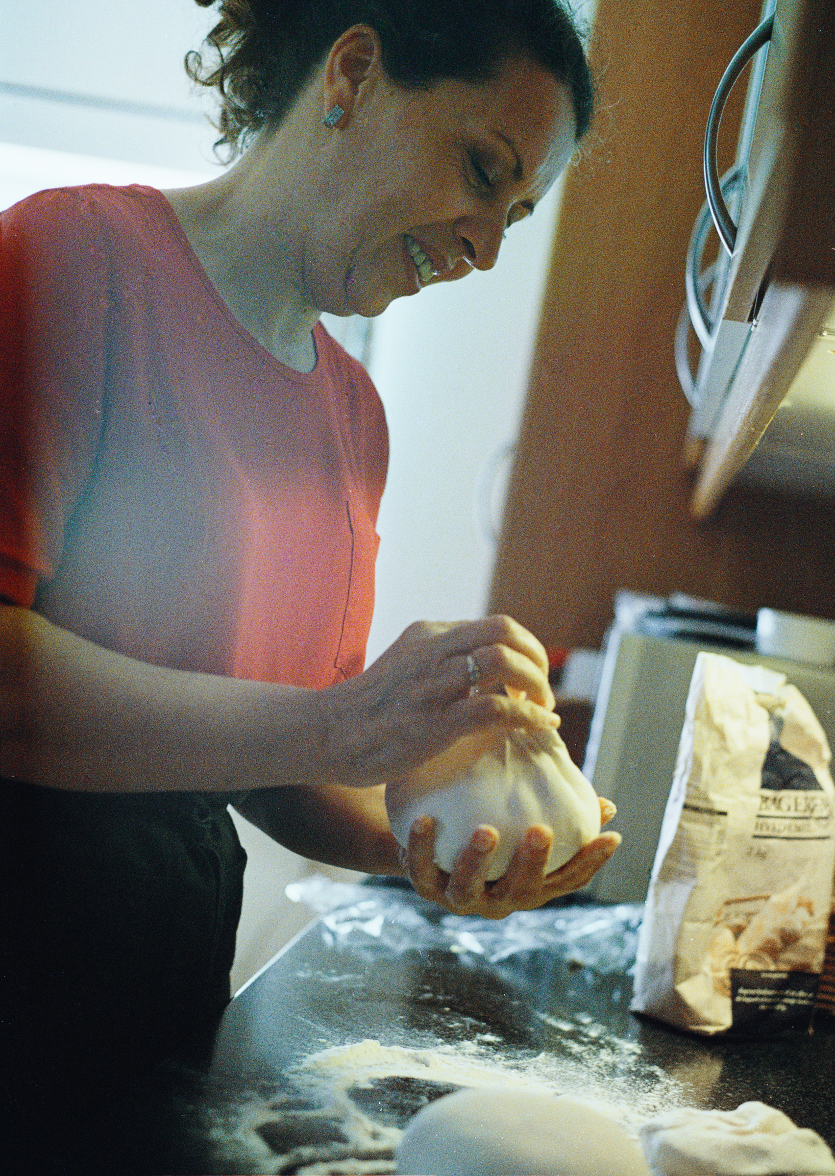 Ok. Ikke forvirre dejen. Got it. Dejen skal være så tynd, at man kan læse, hvad der står i en avis, hvis den lå under. Først ruller min mor dejen ud, og så balancerer hun den forsigtigt på sine håndled, mens hun vender den rundt flere gange. På den måde gør tyngdekraften al arbejdet for hende, og så kan hun forsigtigt lægge dejen ned på bordet, når det har den rette tykkelse.