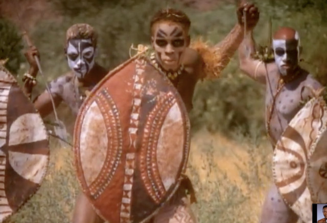 The video wastes no time in bringing the drama with the initial dance sequence, in which a group of what the song’s Wikipedia page generalizes as “African” hunters are stalking lions. Not to be that bitch, but I just took a class on African performance and fine arts, and I don’t recognize any of this anachronistic ass garb or face paint. I definitely don’t remember seeing any African hunters with hair as layed as homeboy’s on the left. MJ arises from the dust and he and the hunters do “West African” choreography (thanks Wikipedia o__0).