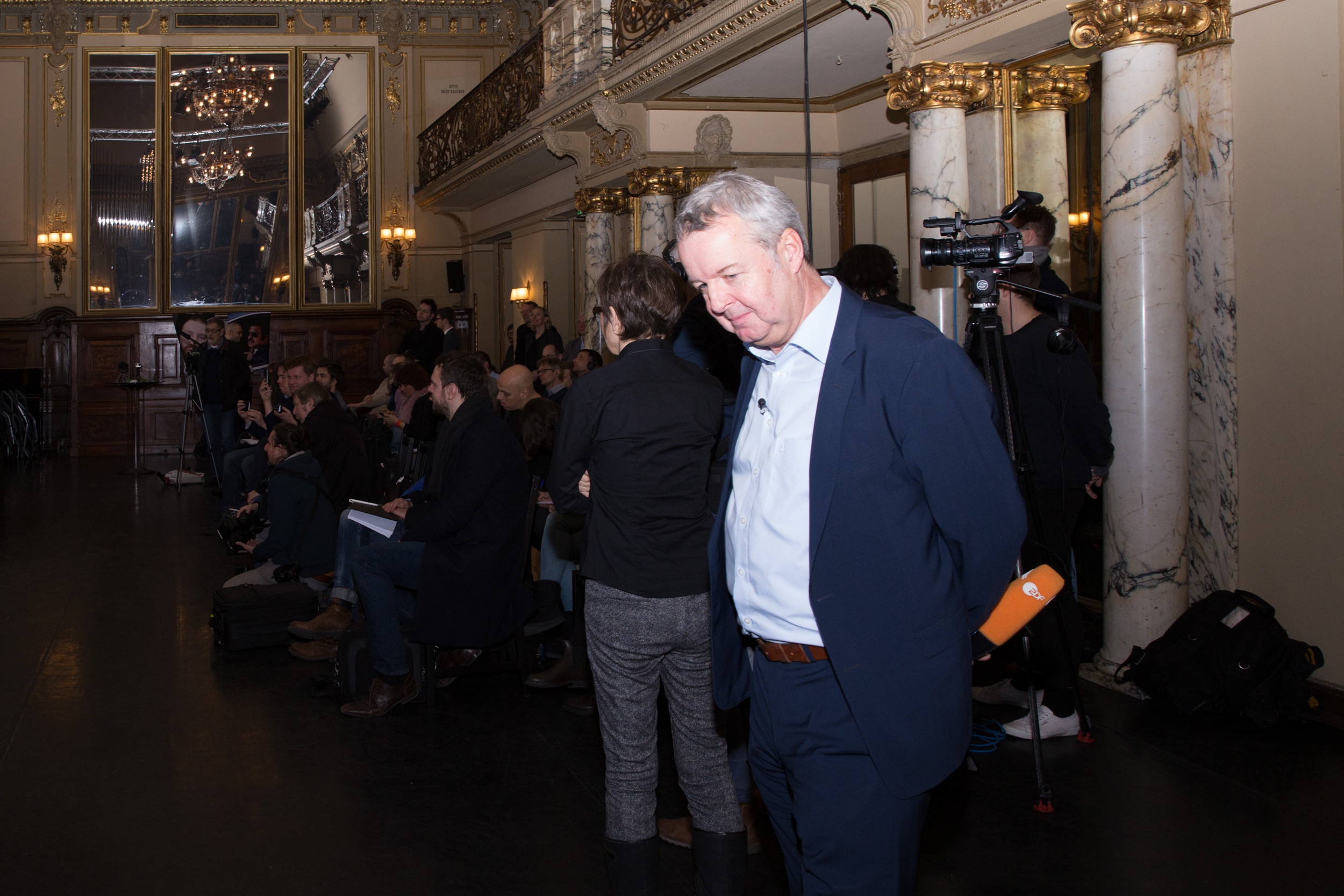 Als die meisten Journalisten nach einem Glas Schampus wieder abziehen, hält Engelbert Sonneborn einen rosa-farbenen Luftballon in der Hand, auf den eine PARTEI-Politikerin mit Edding Geburtstagsglückwünsche geschrieben hat. Die PARTEI-Mitglieder bauen ab und rollen die Banner zusammen. Einer Brecht-Büste setzen sie eine Ballermann-Sonnenbrille mit Sonneborns Gesicht auf den Gläsern auf. Dann laufen die PARTEI- und Piratenfunktionäre gemeinsam mit Sonneborn senior zur Kantine des Theaters. Und ja, jetzt kommt endlich der Moment, wegen dem ihr angefangen habt zu lesen. Denn selbstverständlich wollen wir dem bisher geradezu sprachlosen Kandidaten doch noch ein paar Worte entlocken.