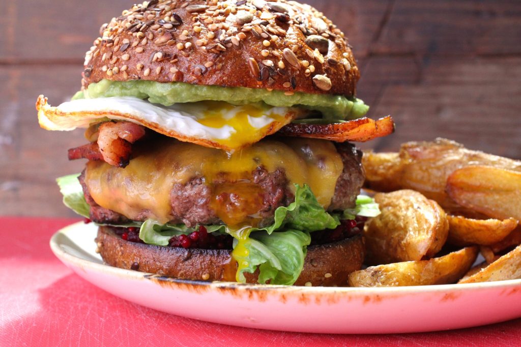 6. Jetzt den Burger zusammenbauen: Dafür etwas Rote-Bete-Relish auf die untere Bunhälfte geben, dann zwei Salatblätter gefolgt vom Patty. Darauf 2 Scheiben Bacon, Gewürzgurken und dann das Spiegelei anrichten. Ein Viertel der Avocadocreme auf die obere Bunhälfte geben, zusammensetzen und mit frittierten Hörnchen-Kartoffeln servieren.