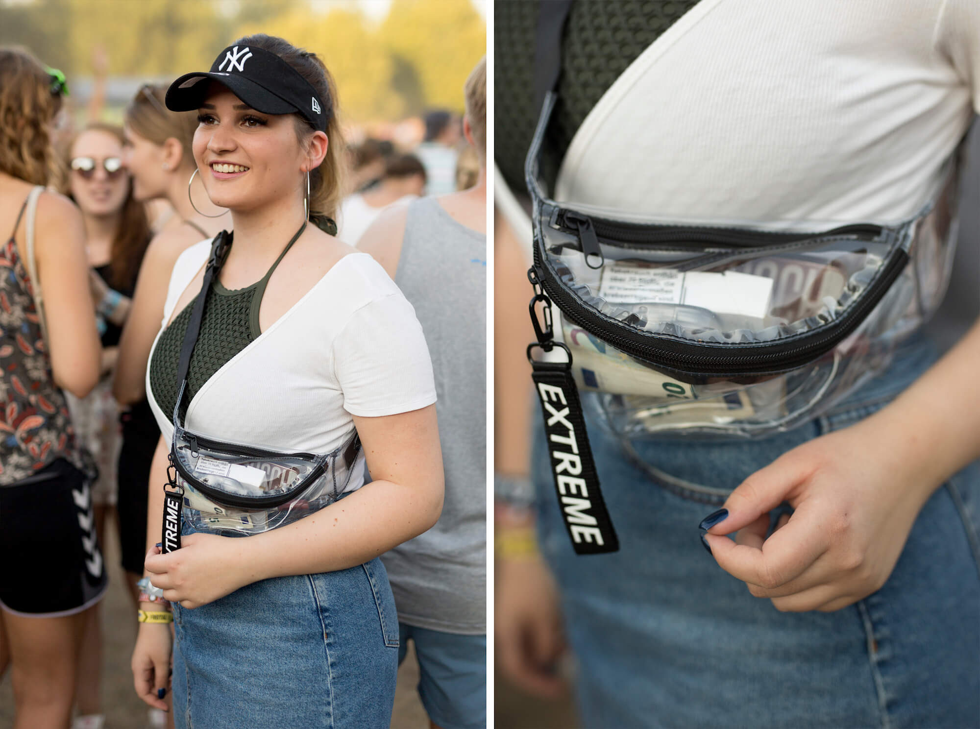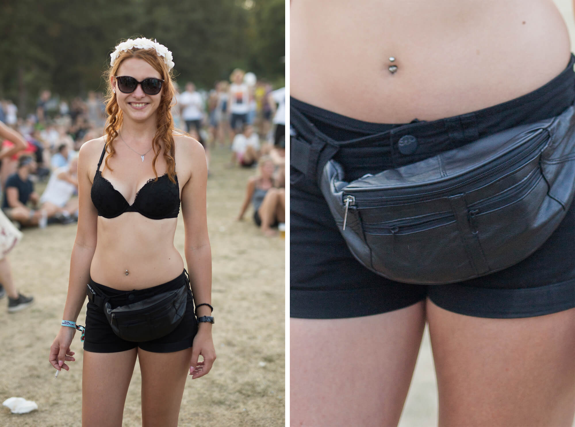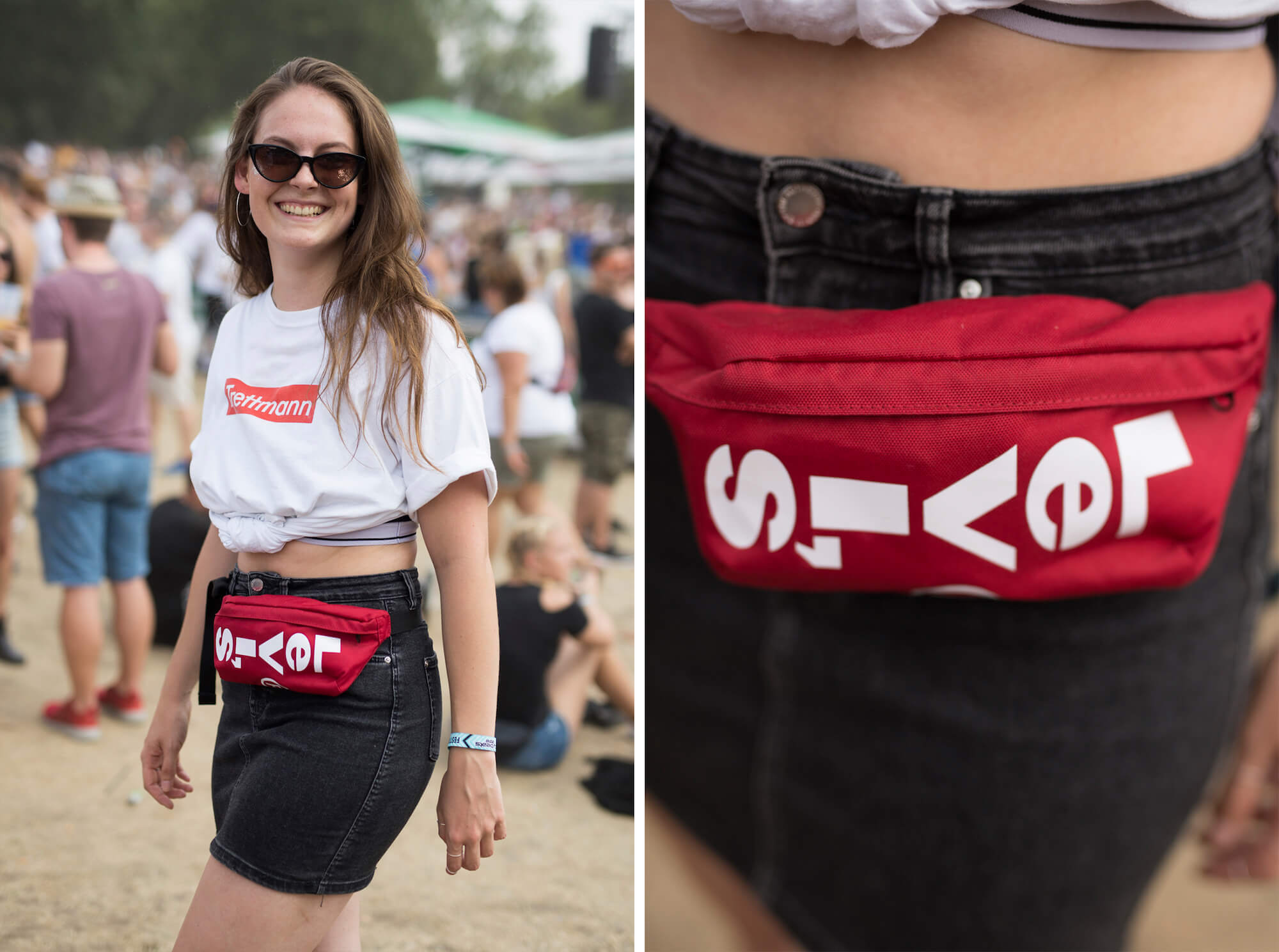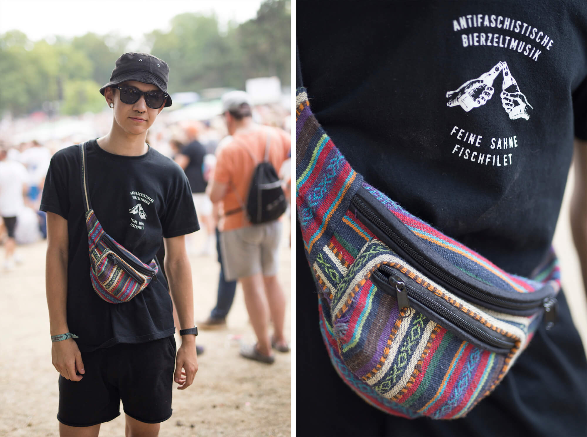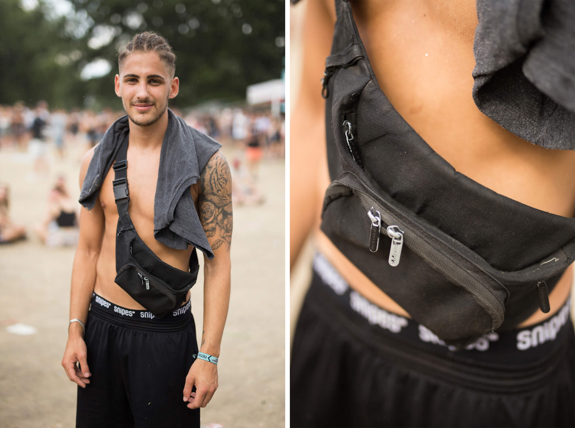 Das Gute an so einem Stadtfestival ist ja, dass man nicht campen muss. Also gehts frisch geduscht und mit den liebsten Klamotten aufs Festival. Immer dabei muss natürlich die Bauchtasche sein. Wo soll man auch sonst Portmonee, Sonnenbrille, Kippen, Taschentücher, Handventilator, Brillenetui, Power Bank und Regenschirm verstauen? In einem Jutebeutel etwa!? Kommt schon, wir waren nicht beim Tag der offenen Tür des örtlichen Baumarkts, sondern beim Juicy Beats! Und genau dort haben wir auch verdammt viele Bauchtaschen gesehen, die unser Fotograf Hakki Topcu kurzerhand fotografiert hat. Die Bilder zeigen, dass das schönste Festival-Accessoire immer noch über der Schulter hängt.