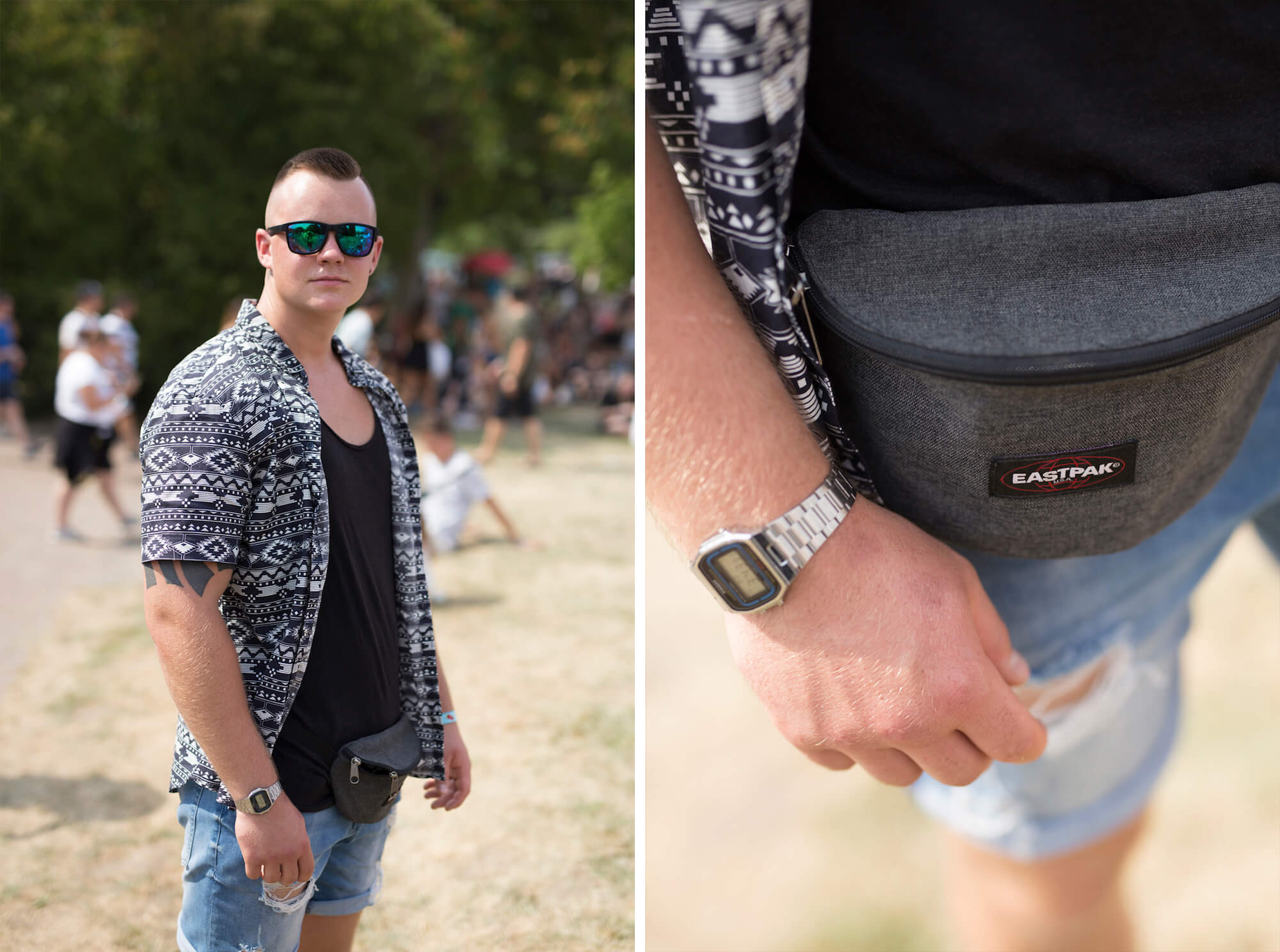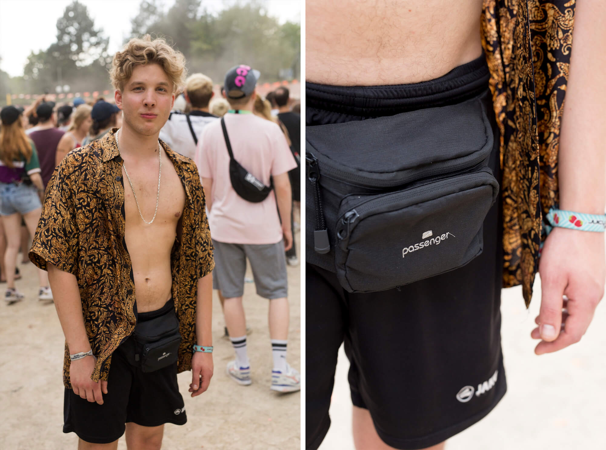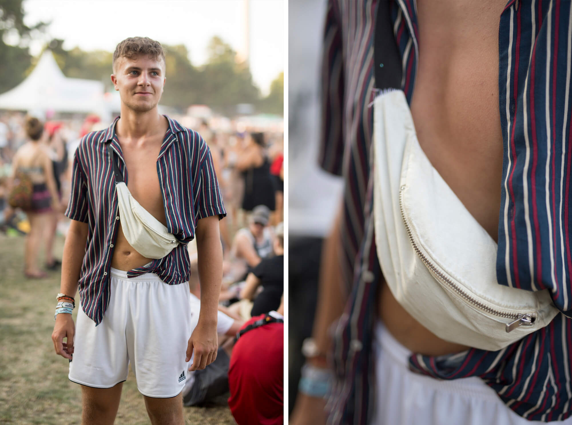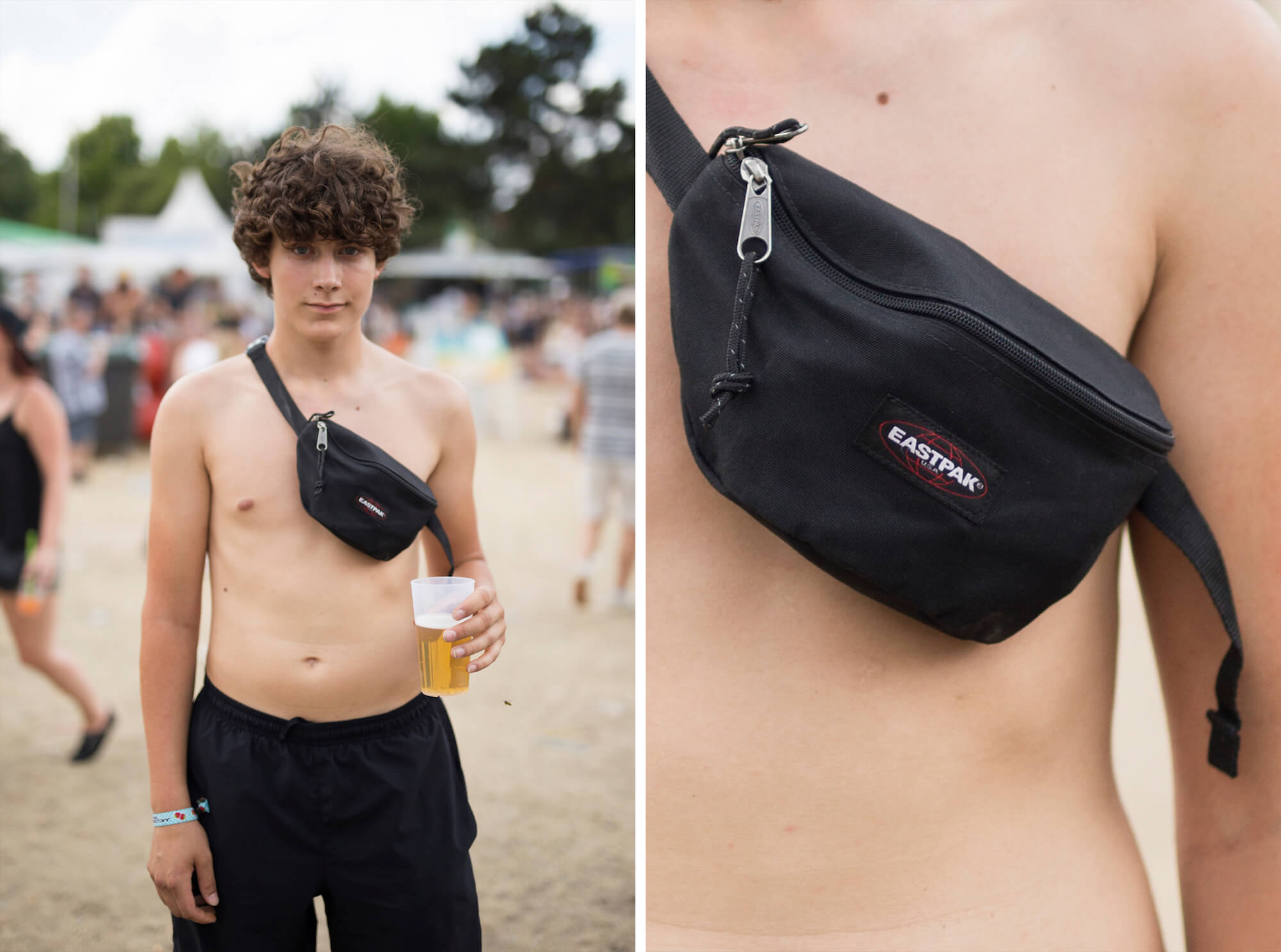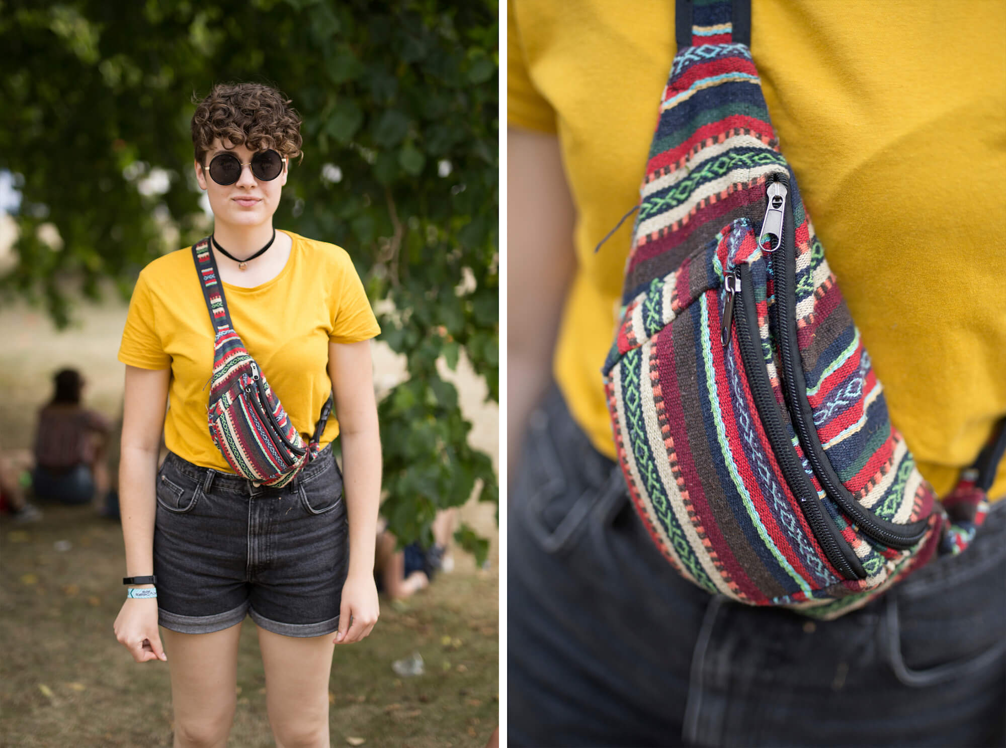 Das Gute an so einem Stadtfestival ist ja, dass man nicht campen muss. Also gehts frisch geduscht und mit den liebsten Klamotten aufs Festival. Immer dabei muss natürlich die Bauchtasche sein. Wo soll man auch sonst Portmonee, Sonnenbrille, Kippen, Taschentücher, Handventilator, Brillenetui, Power Bank und Regenschirm verstauen? In einem Jutebeutel etwa!? Kommt schon, wir waren nicht beim Tag der offenen Tür des örtlichen Baumarkts, sondern beim Juicy Beats! Und genau dort haben wir auch verdammt viele Bauchtaschen gesehen, die unser Fotograf Hakki Topcu kurzerhand fotografiert hat. Die Bilder zeigen, dass das schönste Festival-Accessoire immer noch über der Schulter hängt.