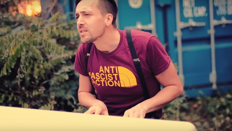Danach folgte Anfang November Koljah mit seiner Gangster-Interpretation von SXTNs “Die Fotzen sind wieder da”, worin er sich in Doubletime durch den Banger der beiden Berlinerinnen Nura und Juju flext. Nun also das aktuelle Stück aka Abklatsch #3 mit Danger Dan. Der sitzt im stylishen, bordeauxfarbenen T-Shirt mit der Aufschrift “Anti Fascist Action” – designt im Northface-Gedächtnis-Look – am Klavier.