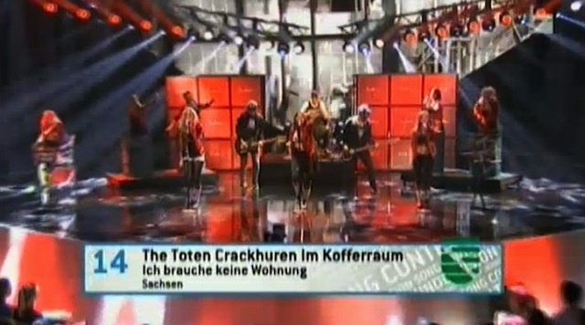 Niemand von The Toten Crackhuren im Kofferraum spricht richtig sächsisch und das macht mich traurig. Entgegen ihrem Namen und ihrem Image haben sie den bisher am wenigsten geisteskranken Auftritt und das bei einer Veranstaltung, bei der bisher ungefähr jeder Song so aufregend wie ein Streichelzoo-Livestream war.