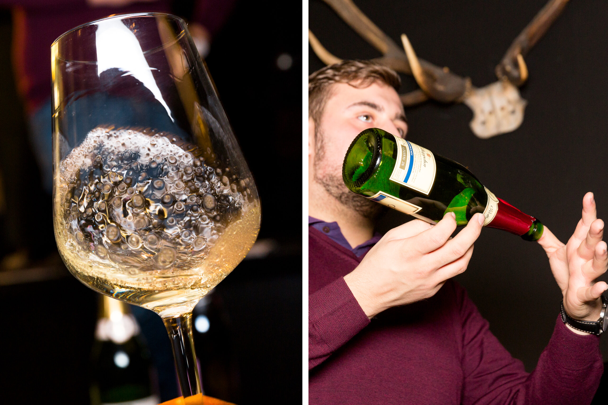 “Eigentlich sollte man Sekt nach dem Einkauf ein paar Wochen liegen lassen. Wenn ihr ihn transportiert habt, braucht er erst wieder ein bisschen Ruhe”, sagt er, während er die nächste Flasche öffnet und mit dem Korken fast den Fotografen abschießt. Klassischer Billigsekt sei hingegen für den direkten Verzehr bestimmt und wird mit zunehmender Lagerung schlechter. Wirklich mindblown sind wir allerdings erst, als Brandweiner ausführt, dass wahrscheinlich jeder unserer Testsekte aus roten Trauben hergestellt wurde. Die Farbe im Sekt oder Wein kommt nämlich nicht davon, welche Art von Traube man zur Herstellung nimmt – sondern von den hinzugefügten Traubenschalen. So nimmt der Saft die Taninstoffe auf und die Farbe an.