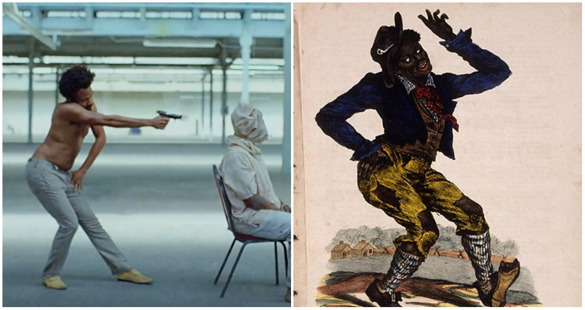 Die ersten Tanz-Szenen und die anschließende Pose, in der Donald dem Gitarristen in den Hinterkopf schießt, mit durchgedrücktem Rücken und dem auf Hüfthöhe aufgestütztem Arm, erinnern stark an die Karikatur Jim Crow. Vor allem im 19. Jahrhundert wurden die Gesetze der Rassentrennung von Kritikern auch als Jim-Crow-Laws bezeichnet. Der Audruck Jim Crow beschrieb das rassistische Stereotyp des singenden und tanzenden, unterdurchschnittlich intelligenten Schwarzen, der mit sich und der Welt zufrieden ist. Passend dazu die Worte “This is America”. Auch wenn der Stereotyp uralt ist, ist er immer noch in viele Köpfen präsent.
