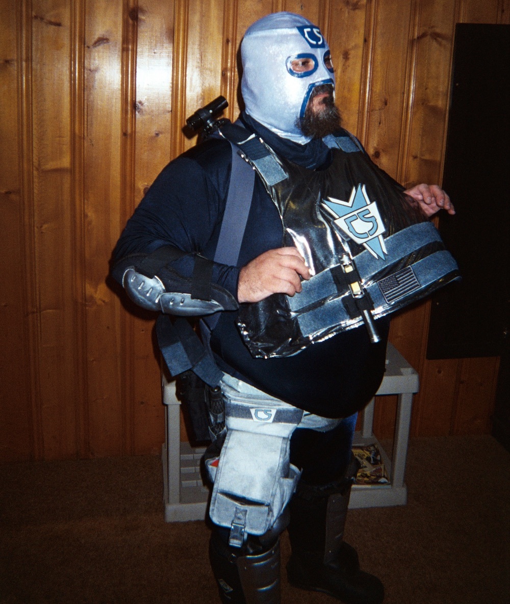 Die Grundlage kommt von Jeffrey Scott, einem Designer in Chicago, der Männerbekleidung zum Gewichtheben und Radfahren herstellt. Die Maske habe ich als Unikat bei einem Maskenmacher bestellt. Die Stiefel sind Arbeitsstiefel und die Rüstung ist Bereitschaftsausrüstung von der Polizei, die ich von Online-Anbietern bestellt habe. Ich habe einen Elektroschock-Schlagstock; das Ding sieht aus wie aus einem Sci-Fi-Film. Dann habe ich noch einen Polizei-Teleskopschlagstock. Außerdem trage ich immer Pfefferspray bei mir und bin mit einer Körperkamera ausgestattet. Falls jemand noch Vorschläge für coole Ausrüstungsgegenstände hat, ich bin ganz Ohr!