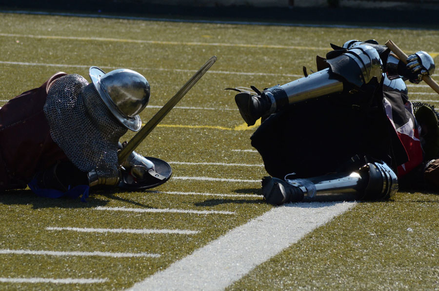 Fotografin Danielle Parsons hat das Team der USA Knights während des Training in Kensington, Philadelphia, besucht. (Da lebt auch Rocky in den Filmen) Ich denke, die Fotos von Danielle sprechen für sich; es ist ein Vollkontaktkampf. Das ist kein LARP, die Typen prügeln nicht mit Schwimmnudeln aufeinander ein und spielen dann tot. Du musst beim Kampf also davon ausgehen, dass du ordentliche Faust- und Schwertschläge abbekommen wirst und dir vielleicht jemand die Kniescheibe raustritt. Diese Sportart ist nichts für Weicherer, soviel steht fest.