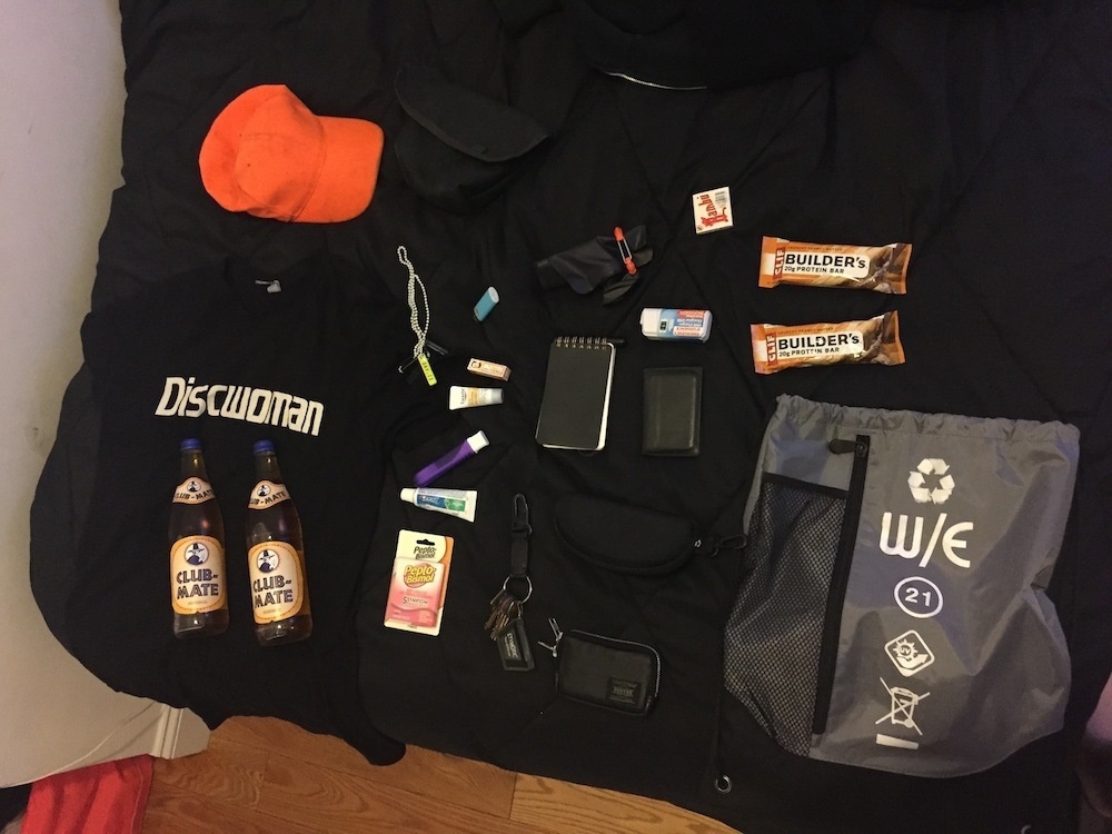 Stunde 1, 22 Uhr: Ich bereite mich quasi auf meinen Technothon2015 vor und packe meine Tasche wie folgt: Notizblock, Wasserflasche, Toilettenartikel, Party-Hilfsmittel und zwei Flaschen Club Mate (inzwischen auch in Brooklyn angekommen und in der dortigen Technoszene trotz des unverschämten Preises unglaublich beliebt), die ich mir extra für diesen Grund aufgespart habe. Ich mache mich auf zum Bossa Nova Civic Club – einer Bar in Bushwick, die gleichzeitig mein liebster Techno-Treffpunkt ist. Lauren Flax (von Creep) und Gavin Russom sind hier Residents, aber der Laden ist noch nicht besonders voll. Ich meditiere ein bisschen, um mich auf den Wahnsinn vorzubereiten, der mir später noch bevorsteht.