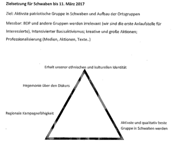 Man erfährt, dass die Identitäre Bewegung bis zum 11. März die aktivste patriotische Gruppe in Schwaben werden will. Dafür hat sie vor, sich mit der AfD, der Jungen Alternative, mit Burschenschaften und anderen Nationalisten zu vernetzen.