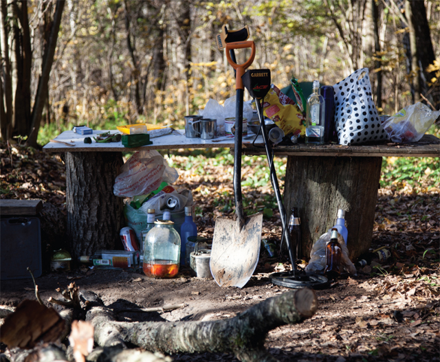 Einer davon ist Nikita. Über vKontakte habe ich den langjährigen Digger und begeisterten Uhrensammler vor einiger Zeit kennengelernt. Er trägt auf sämtlichen Fotos im Netz deutsche Uniform und nimmt anscheinend regelmäßig an Reenactment-Events teil, bei denen der Zweite Weltkrieg mit Platzpatronen und Fakegranaten nachgespielt wird. Ohne seine Uniform sieht er allerdings ziemlich normal aus. Er erzählt mir, dass er seit zehn Jahren zusammen mit seinen Kumpels mehrmals im Jahr in der Nähe des ehemaligen Moskauer Verteidigungsringes campen fährt, um mit Metalldetektoren nach Weltkriegsgegenständen zu suchen. Neben Nikita lerne ich seine Freundin Olga und seine Kumpels Tim und Vanja kennen. Alle sind Ende 20 und haben Business Management oder Foreign Languages studiert. Nikita arbeitet in einer Versicherung, Vanja verlegt Internetkabel auf Hausdächern, und Tim arbeitet als Verkäufer. Sie vereint ihr gemeinsames Schwarzgräber-Hobby.