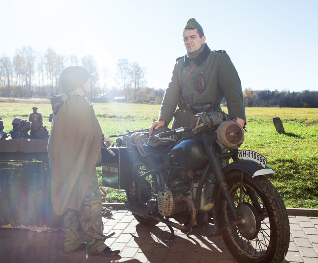 Wenig später hört man ein altes Motorrad über die Wiese vor unserem Camp näherkommen. Die Maschine sieht aus wie aus den 40er Jahren, an der Satteltasche klemmt ein deutsches Maschinengewehr und der Fahrer trägt eine Naziuniform mit Stahlhelm und Waffenrock. In fließendem Deutsch stellt er sich als Alexej vor. Er ist Ende 30, Reenactor und gehört zu einer größeren Truppe Russen, die an diesem Wochenende die Schlacht von Borodino lebensecht darstellt. Mit Panzern, Granaten und Hunderten von Soldaten. „Ein Spektakel für die ganze Familie“, wie er uns versichert. Alexej hat früher selbst gegraben. Allerdings in der Nähe von St. Petersburg und Wolgograd, dem ehemaligen Stalingrad. Dort würde man viel mehr finden, als im schon lange abgegrasten Borodino. Er sagt, ihm wäre es damals aber hauptsächlich darum gegangen, echte Geschichte zu spüren und in den Händen zu halten.