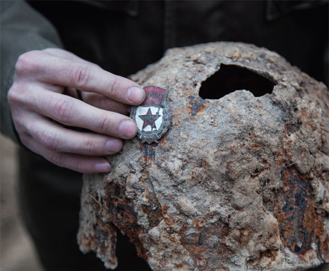 Er sieht aus, wie man sich den Anführer einer solchen Truppe vorstellt. Er trägt ein Muskelshirt und seine Haare kurz rasiert. Mit stechendem Blick taxiert er jeden einzelnen von uns, bevor er kurz und militärisch jedem die Hand gibt. Dann fragt er meinen Übersetzer über mein Vorhaben aus. Zwischendurch zeigt er mir auf seinem Smartphone kurze Videos von Maschinengewehren, die er abfeuert, und von einem Bagger, den er selbst über Holzplanken auf einen Sowjettruck lenkt. Und natürlich Fotos von reichlich Knochen und Schädeln, die er alle gefunden habe, wie er versichert.