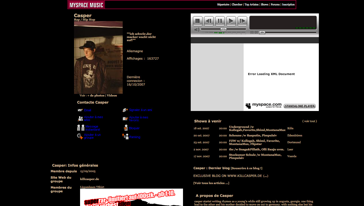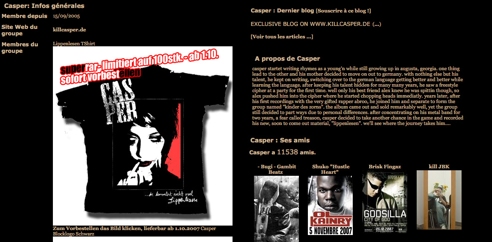 Gigs: Laut Profile Views sind K.I.Z. 2007 mehr als doppelt so berühmt wie Casper, aber nur ein Zehntel so beliebt wie Boys Noize. Das gilt auch für Gigs: Kiel, Lörrach, Braunschweig und Bielefeld. Wobei in Bielefeld noch nicht mal die Location feststeht.