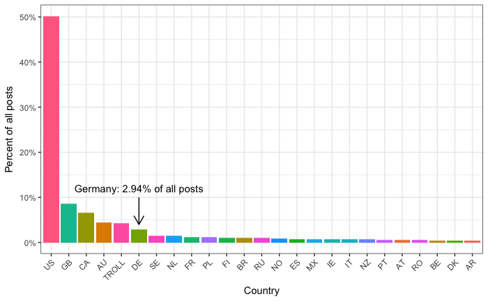 Mit 1.538.034 Posts stellt Deutschland knapp drei Prozent aller Posts auf /pol/ im Untersuchungszeitraum. Damit liegt es insgesamt auf Platz fünf aller Länder, die zum “politisch inkorrekten” Forum beitragen, wenn man nicht die länderlose Trollflaggenfraktion einrechnet. Deutschland ist damit das größte Ursprungsland für Beiträge auf /pol/ nach den englischsprachigen Ländern, die zusammen etwa zwei Drittel aller Posts produzieren.