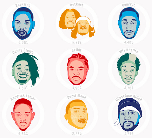 „Es ist immer noch nicht perfekt“, schrieb Daniels damals. „HipHop ist voller Slang, der schwierig zu transkribieren ist, zusammengesetzte Wörter, Feature-Rapper und sich wiederholender Refrains.“ Trotzdem haben uns seine kreativen Bemühungen verbildlicht, welche Rapper augenscheinlich ihre Vokabelhausaufgaben gemacht haben. Jetzt hat Daniels jedoch ein Update zu seinem Projekt veröffentlicht, durch das wir noch ein paar interessante neue Leckerbissen über unsere liebsten Wortschmiede lernen können.