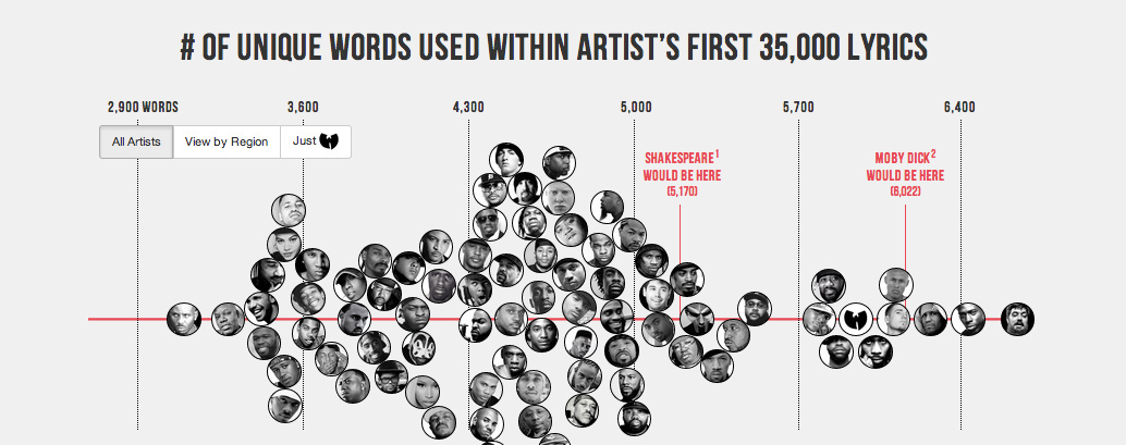 Er fügte außerdem hinzu, dass die notorisch hitzköpfigen HipHop-Online-Mafia-Kommentatoren das Projekt mit Vorsicht genießen sollten. „Seht diese Daten als etwas, das eine interessante Diskussion über HipHop und die Verwendung einzelner Wörtern anregen kann und definitiv nicht als endgültiges Argument für Rapper X ist besser als Rapper Y.“