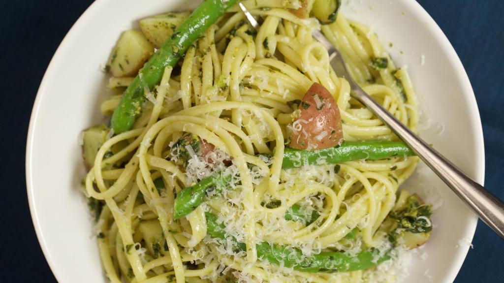 Diese Pasta schmeckt genauso erfrischend, wie sie aussieht, und ist in Nullkommanichts gemacht. Zerstampfe einfach ein paar Pinienkerne mit Basilikum, Knoblauch und Salz in einem Mörser, gieß ein bisschen Olivenöl drüber und gib noch etwas Parmesan hinzu.