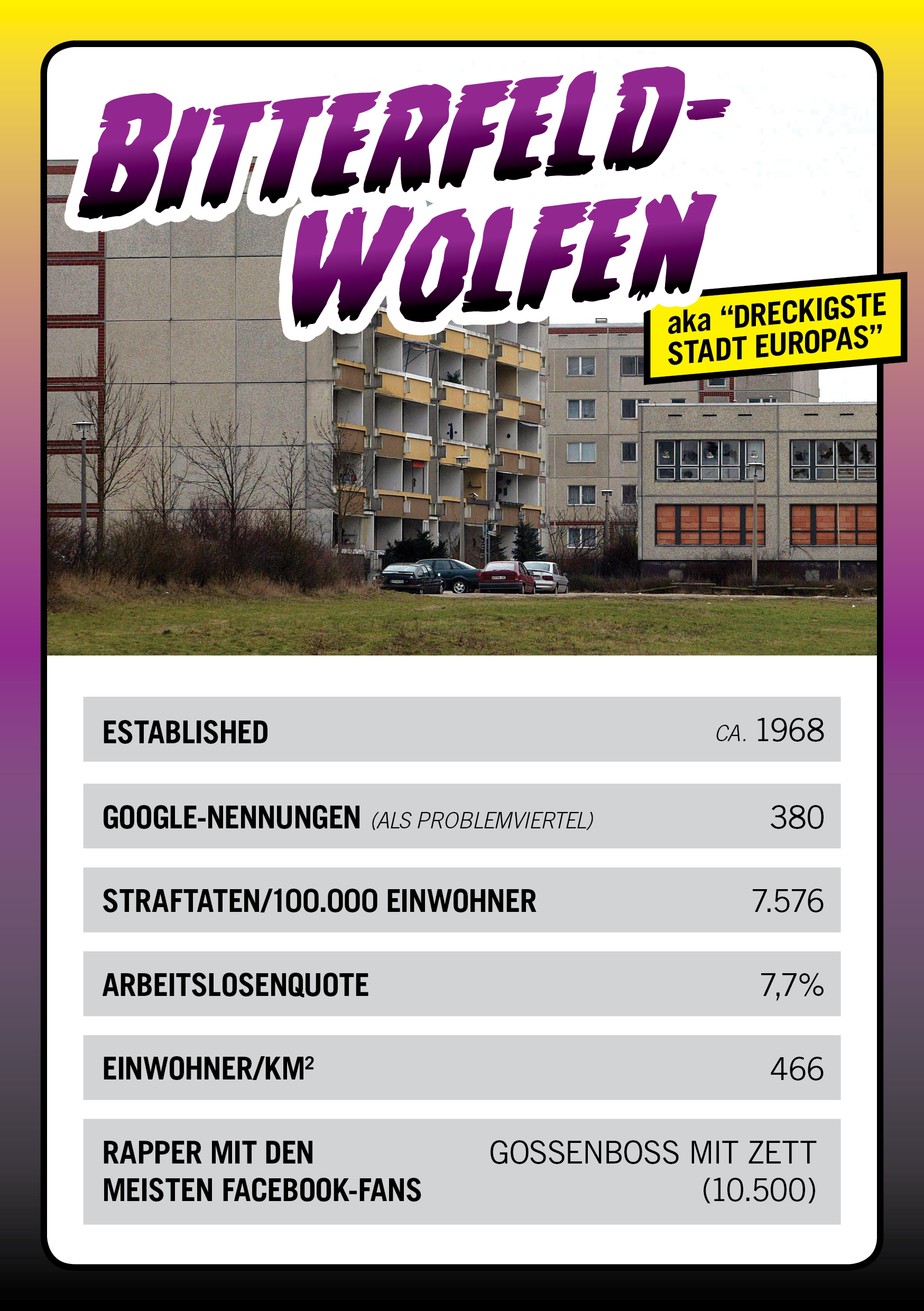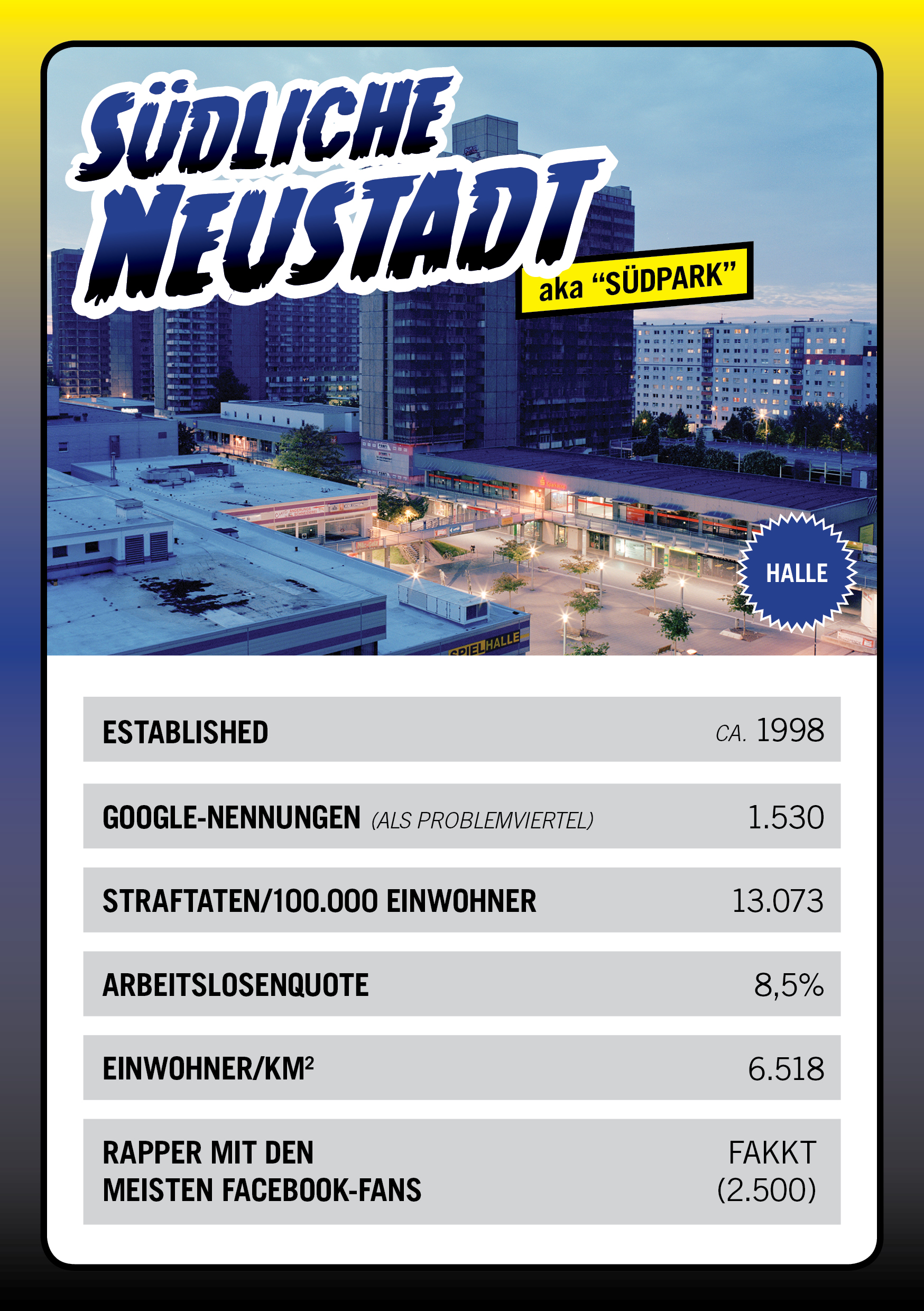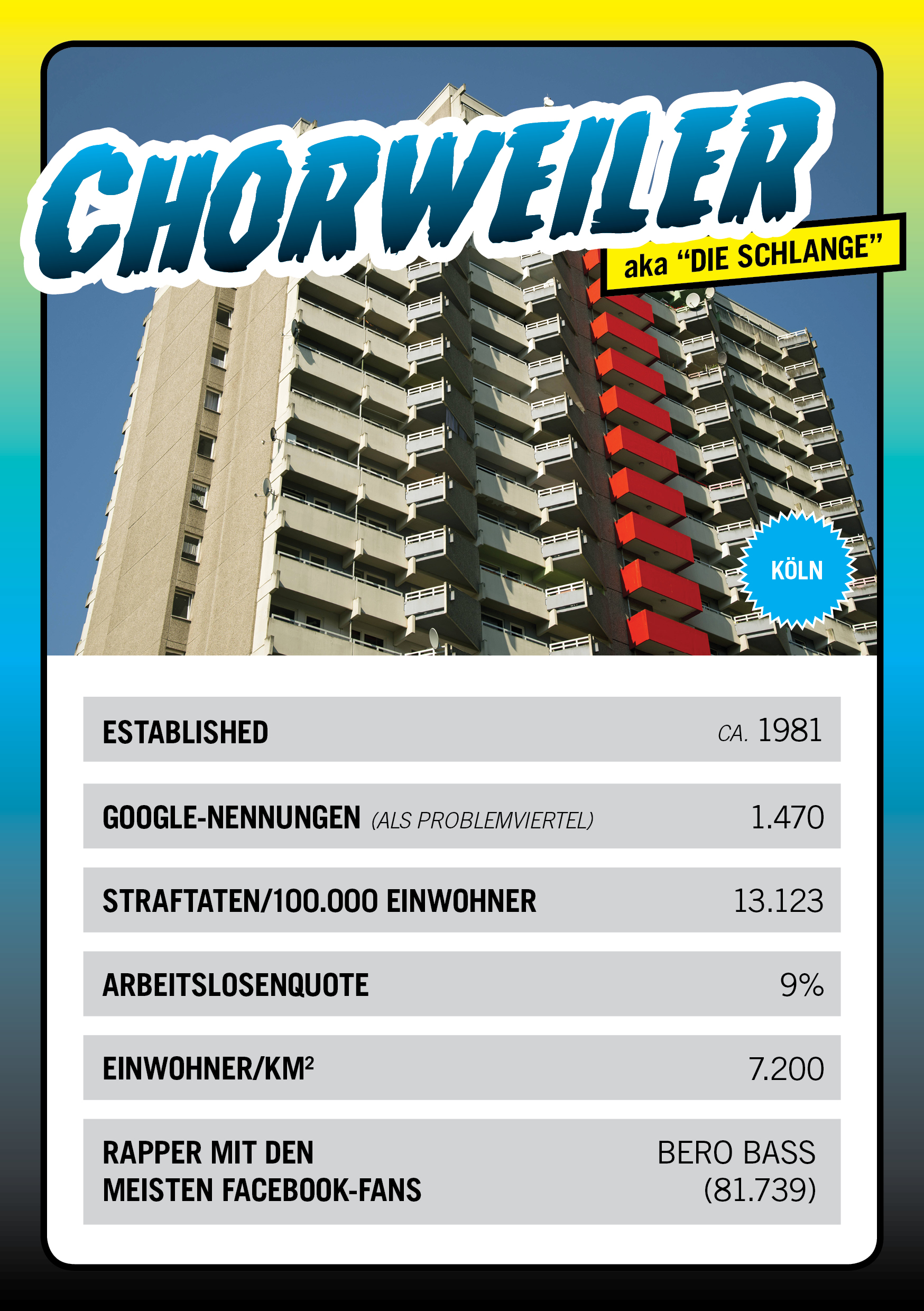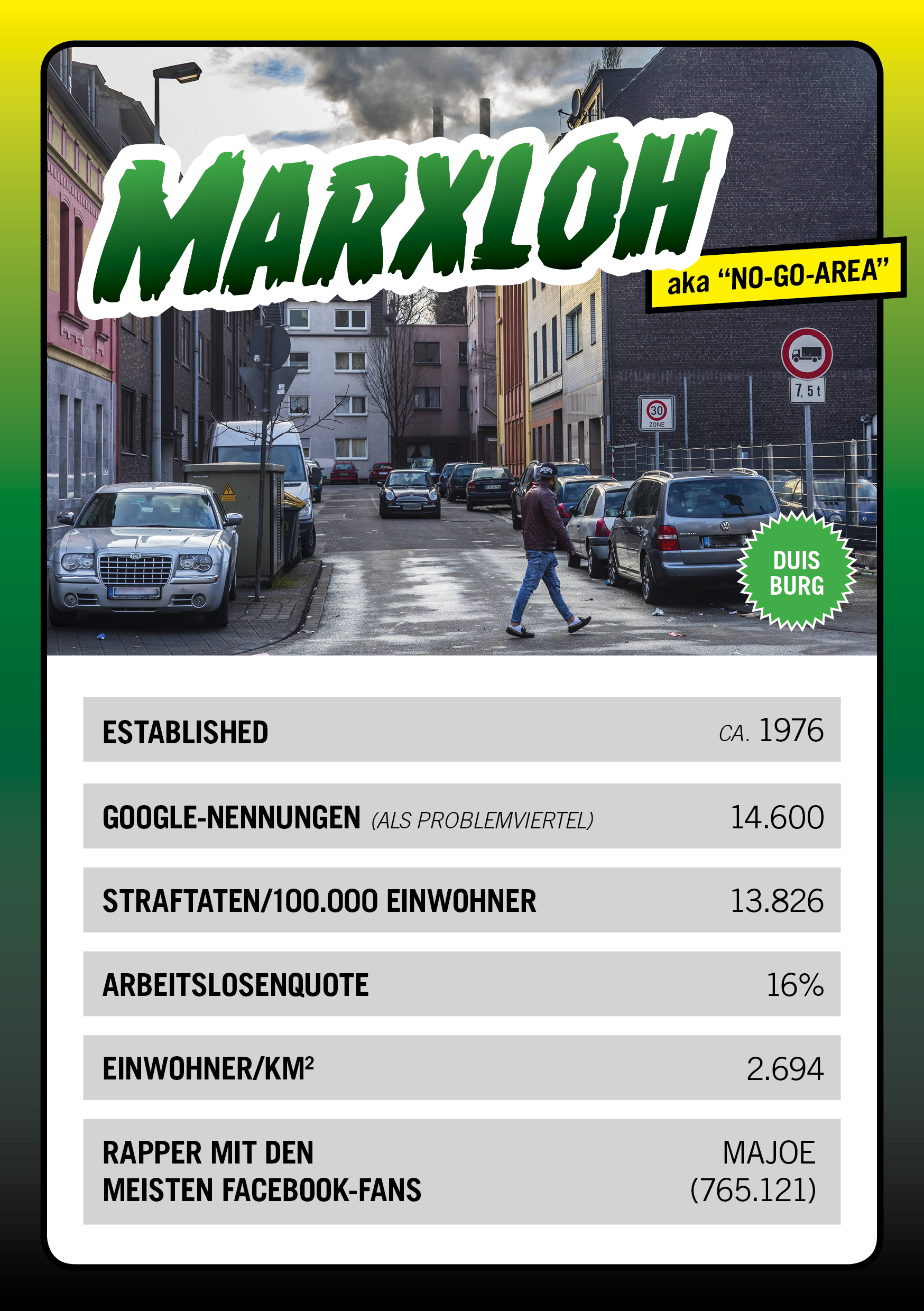 Damit ihr endgültig versteht, welches Problem in welchem Quartier existiert, und wo eine verrufene Gegend vergleichsweise ordentlich abschneidet, haben wir ein kleines Quartett gebastelt. Wenn es mal keine Zahlen für ein bestimmtes Gebiet gab, beispielsweise bei der Kriminalität, haben wir jeweils die Zahl der nächstgrößeren Einheit genommen, manchmal musste das die ganze Stadt sein, in der dieses Gebiet liegt. Bei den Rappern haben wir uns jeweils für einen entschieden, der irgendeinen Bezug zum Viertel aufweist, sei es persönlich oder künstlerisch – oder der auch nur aus der gleichen Stadt kommt.