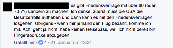 Für einige Reichsbürger ist Trump dagegen der Richtige, um nun einen Friedensvertrag zu verhandeln. Einer der Grundpfeiler der Reichsbürgerideologie ist es nämlich zu behaupten, dass der Zweite Weltkrieg nie wirklich aufgehört habe, weil es keinen Friedensvertrag zwischen Deutschland und den Alliierten gebe. Deswegen existiere der deutsche Staat auch nicht, und so weiter und so fort. Das stimmt zwar alles nicht (wie wir euch hier schonmal erklärt haben), aber – und das ist eine Gemeinsamkeit zu Trump – Fakten sind für Loser.