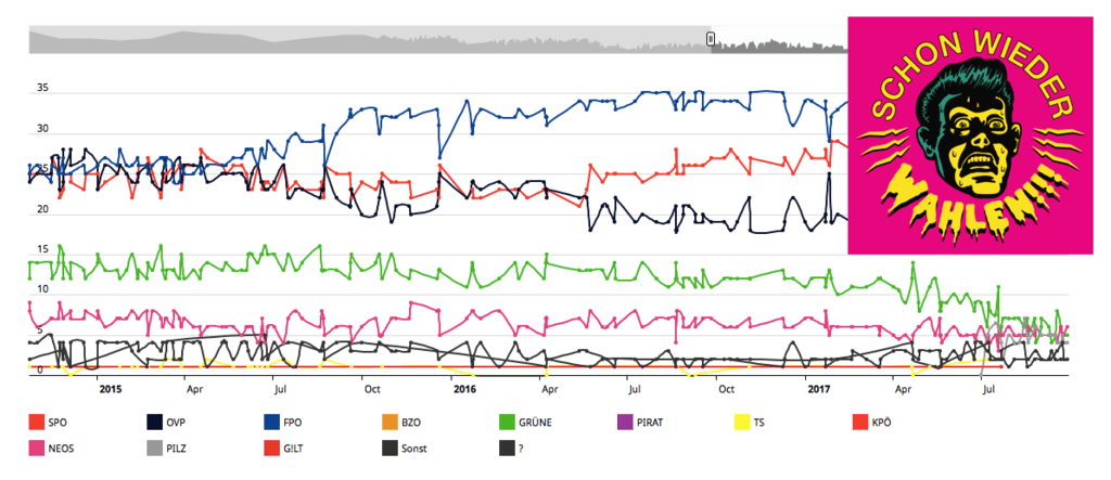 Ab Herbst 2014 gab es zwölf Monate lang drei etwas gleich starke Parteien, ab Herbst 2015 zog die FPÖ auf 30+ Prozent davon. In den Monaten, nachdem Christian Kern im Mai 2016 SPÖ-Parteichef übernahm, kletterte die SPÖ in Richtung 30, die ÖVP eher Richtung 20 Prozent. Mit der Übernahme von Sebastian Kurz kam die ÖVP auf über 30 Prozent, wo sie seitdem auch steht.