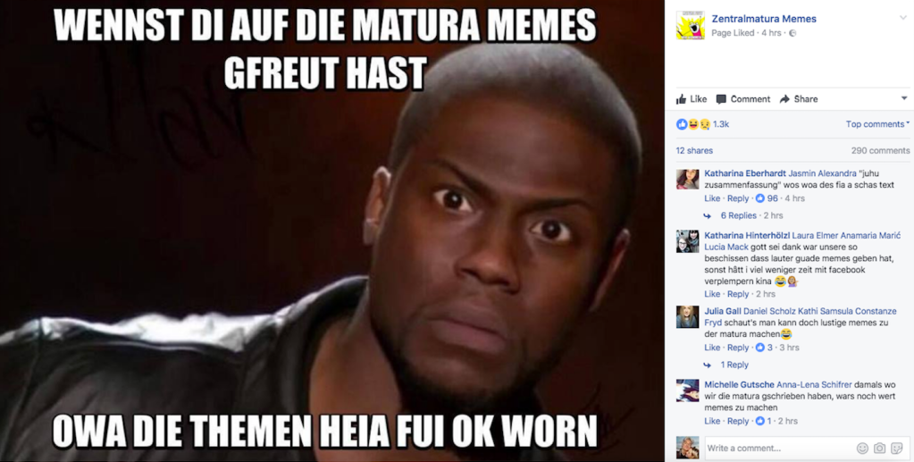 Die erste Meme-Welle ist kaum abgeebt, schon zeigt sich ein Trend hin zum verwirrten Kevin Hart: “Wennst die auf die Matura Memes gfreut hast, owa die Themen heia fui OK woan.” Matura 2017: Eine Mischung aus Enttäuschung über das ausgebliebene Meme-Potential und Zufriedenheit über die unerwartete Lösbarkeit der Aufgabenstellungen, die nicht näher ausgeführt werden. Und weil die einzige Maturantin, die wir kennen, gerade nicht zurückschreibt, liegt es nun also an uns selbst, herauszufinden, was diese Aufgabenstellungen waren – anhand der bisher entstandenen Memes.