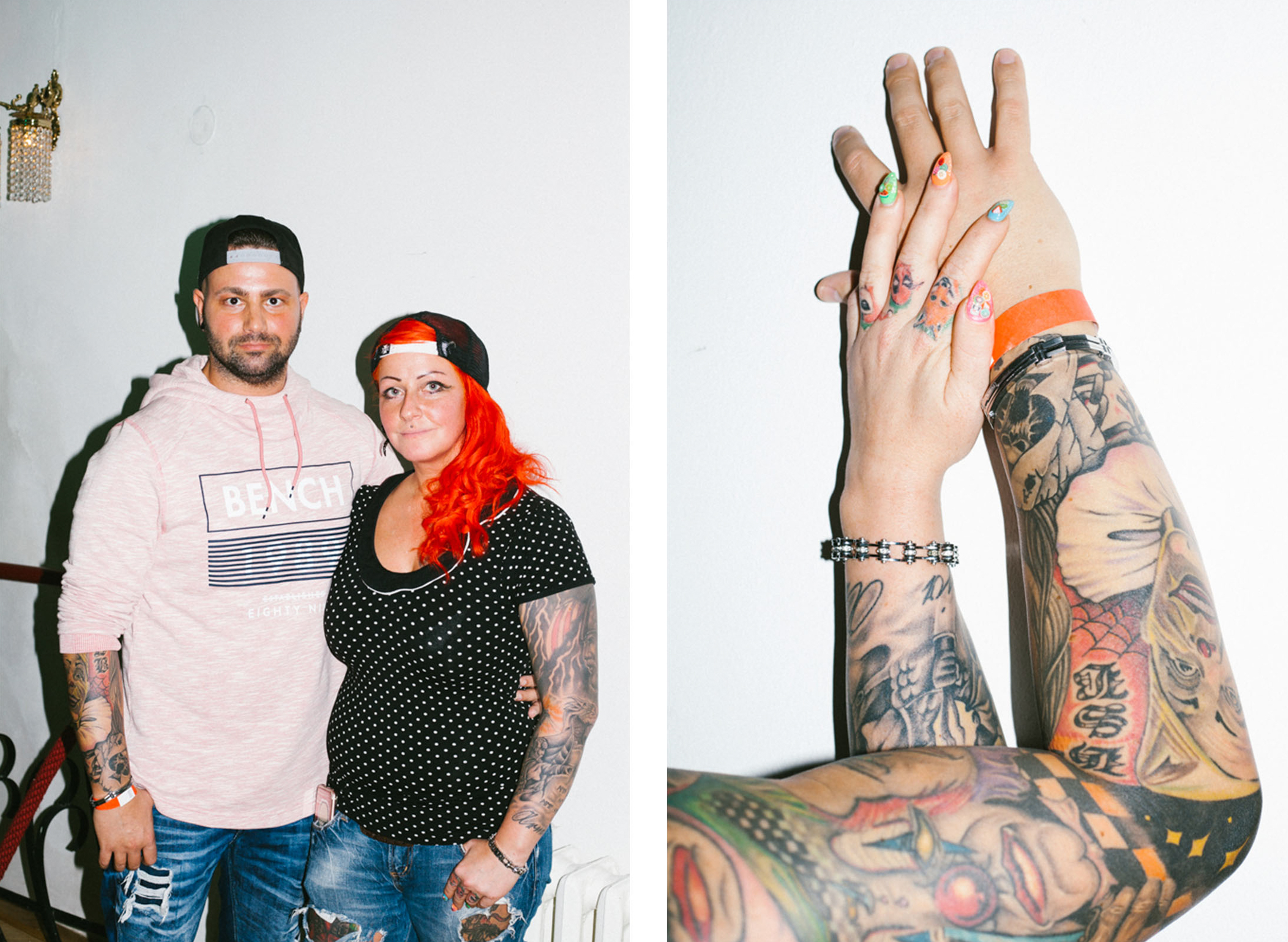 Philipp und Nicole kommen aus Zwickau, beide tragen bunte Tattoos. Nicole kombiniert die mit einer Ansammlung von Piña-Colada-Obstsalat-Motiven auf ihren langen Gelfingernägeln.