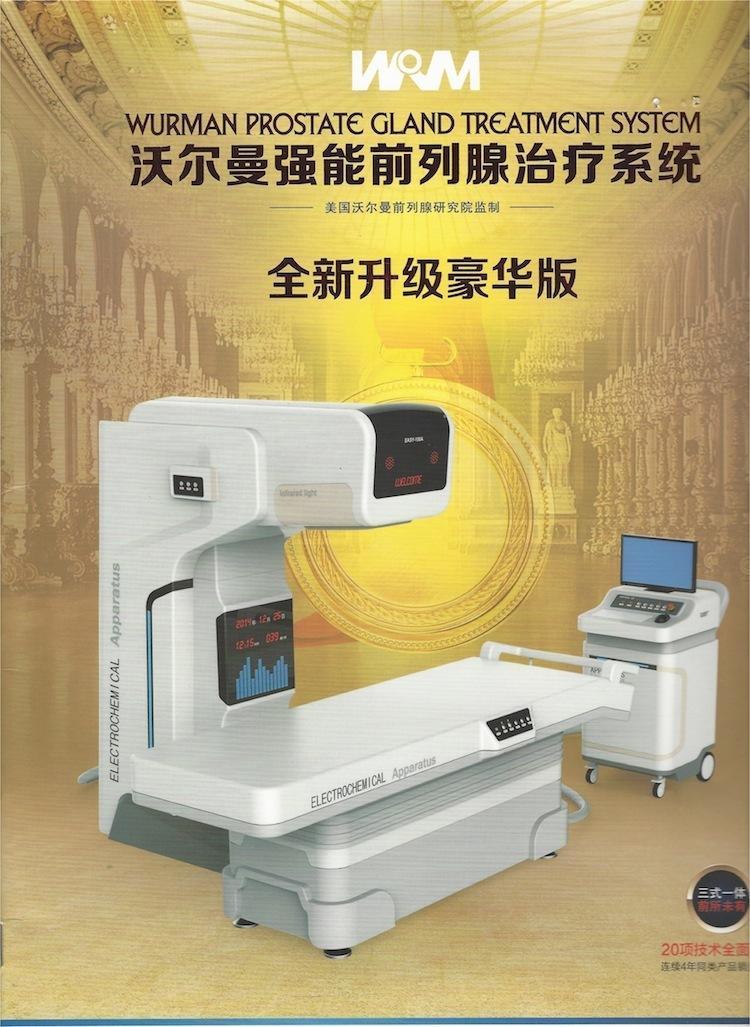 Στο περίπτερο της Shenzhen Yuanda Medical Instruments εντόπισα το μηχάνημα που μάλλον είχε «θεραπεύσει» τον Junjun. Διαφημιζόμενο ως ένα από τα μηχανήματα του Shenzhen City Hospital από το site του ίδιου του νοσοκομείου, βρισκόμουν πλέον μπροστά στο «Wolman Prostate Gland Treatment System». Το μηχάνημα έμοιαζε με μεγάλο μαγνητικό τομογράφο και στην εξωτερική του πλευρά διάβαζε κανείς μεγάλες αγγλικές λέξεις: «Electrochemical Apparatus», «Infrared Light». Πάνω στην επιφάνεια του τραπεζιού όπου ξάπλωνε ο ασθενής υπήρχε ένα πιστοποιητικό που έλεγε πως το μηχάνημα ήταν κατασκευασμένο από το USA Wolman Prostate Institute, που με λίγη έρευνα βρήκα ότι ήταν μια dummy εταιρεία που ήταν εγγεγραμμένη στη Utah από το 2011. H εταιρεία ανήκει στον Yu Dongqing, στον οποίο ανήκουν και 100 άλλες παρόμοιες εταιρείες, πάντα με έδρα την ίδια διεύθυνση και πόλη.