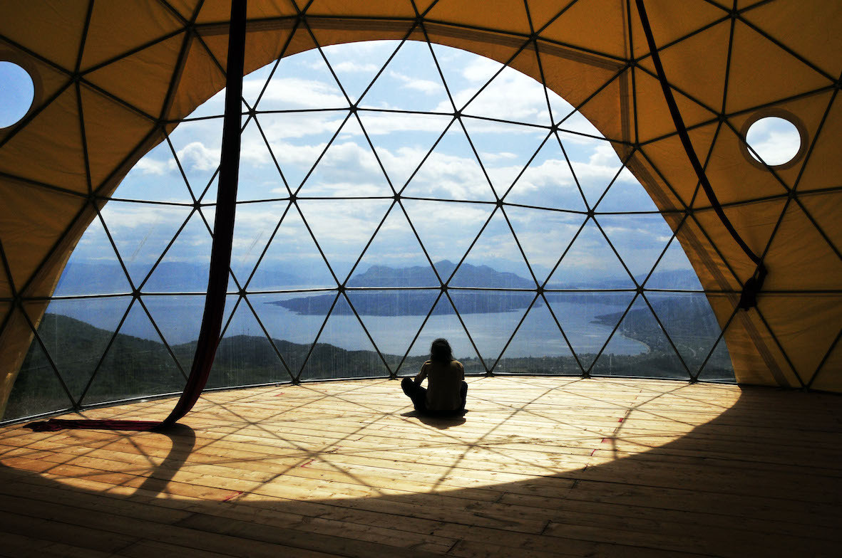 O κεντρικός γεωδεσικός θόλος στο «Τελέθριον Project». Έχει περίπου 100 τ.μ. μέγεθος και θα έχει και δεύτερο όροφο περίπου 70 τ.μ. Οι τέσσερις θόλοι γύρω του θα αποτελούνται από περίπου 60 τετραγωνικά ο καθένας.