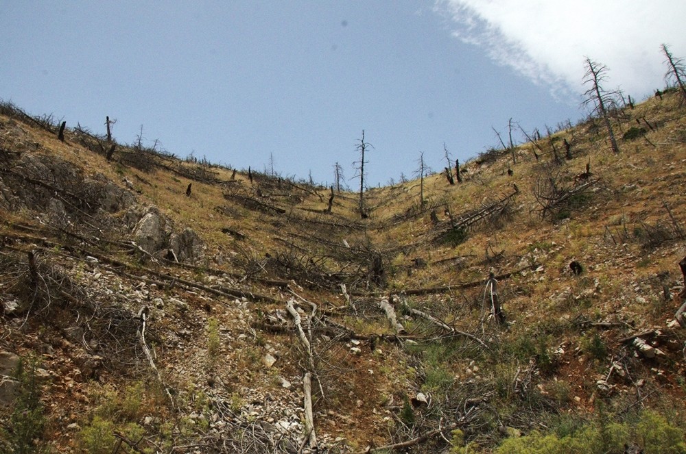 Τους αποχαιρέτησα και συνέχισα να ανεβαίνω το βουνό. Το τοπίο ολοένα και μαύριζε. Αντίκρισα γυμνές, γκρίζες πλαγιές με καμμένα κουφάρια διάσπαρτα δεξιά και αριστερά, πρόχειρα αντιπλημμυρικά έργα και σκουπίδια. Οι μικρές αναδώσεις δίνουν μια ελάχιστη ελπίδα να αναγεννηθεί το δάσος. Τώρα όμως, που όπως κάθε καλοκαίρι ξεκινούν οι πυρκαγιές, είναι αρκετό αυτό για να μας καθησυχάσει;