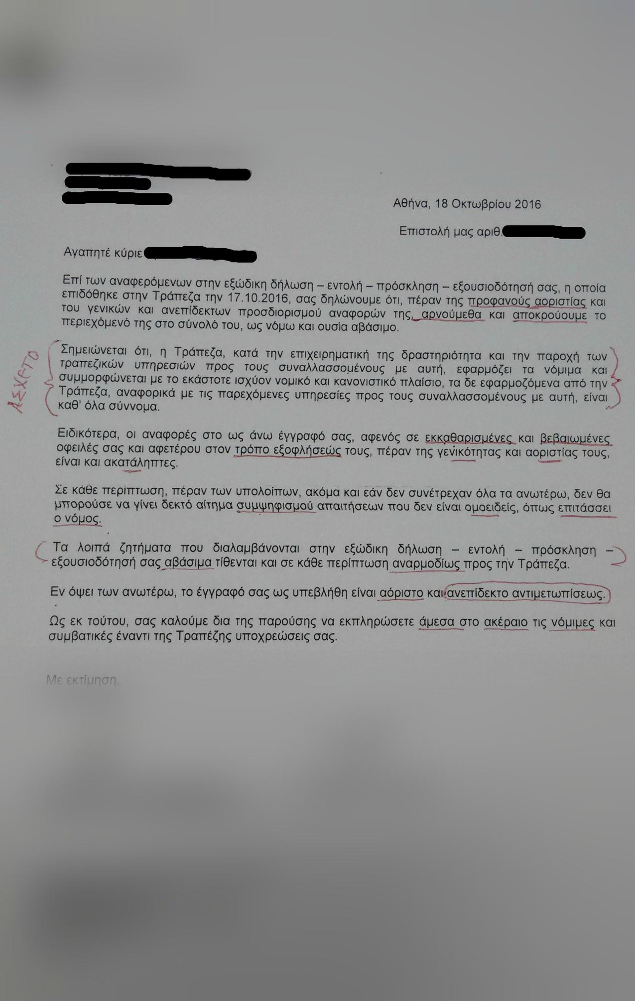 Όταν ένας από τους οπαδούς ρώτησε αν η οργάνωση προσέφερε νομική αρωγή σε περίπτωση που η τράπεζα προσέφευγε στη δικαιοσύνη, η απάντηση της Αντιγόνης ήταν ξεκάθαρη: «Έχουμε μία δικηγόρο που μπορεί να σε κατευθύνει, όμως δεν μπορεί να αναλάβει υποθέσεις μελών. Εδώ κάνετε τα εξώδικα με δική σας ευθύνη. Άλλωστε, τι είναι να πληρώσεις 1.000 ευρώ μπροστά στα τόσα χρέη που γλίτωσες;». Μαζί με την απάντηση, ο εν λόγω κύριος πήρε και ένα χαρτί, με το οποίο «είχες προειδοποιηθεί ότι κάνεις τα εξώδικα με δική σου ευθύνη», όπως του είπε η Αντιγόνη, που κατέληξε: «Όσες αποδείξεις και να έχεις, δεν φτάνουν, πρέπει και να το πιστέψεις. Κάποιοι θα καταλάβετε, κάποιοι δεν πρόκειται να καταλάβετε!».