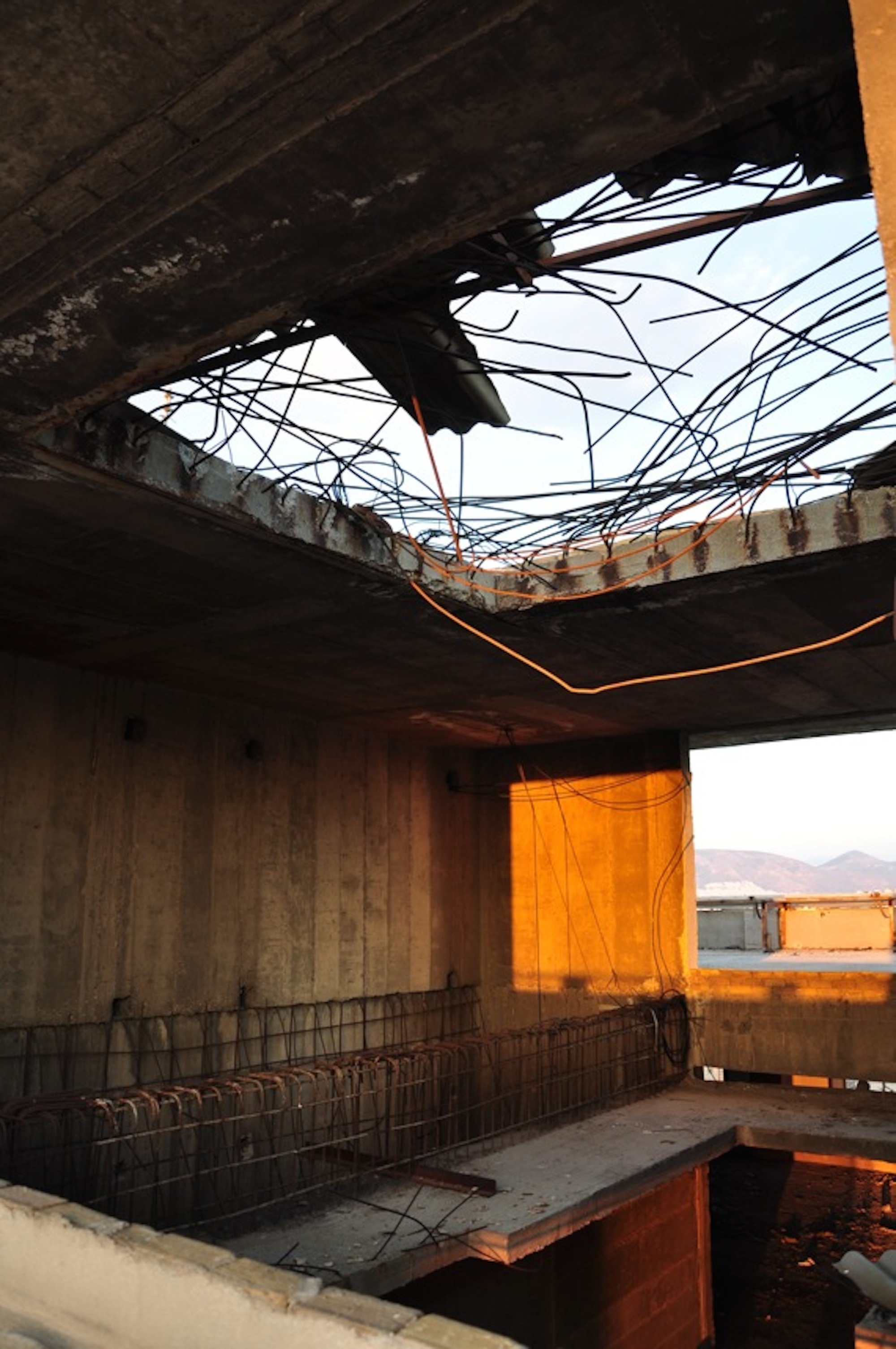 Βλέποντας το για πολλά χρόνια να στέκει επιβλητικό, παρά τον αστικό μύθο που θέλει το κτίριο να γέρνει, να έχει προβλήματα στατικότητας και να έχει κριθεί ακατάλληλο -φήμες που οι αρμόδιοι φορείς έχουν διαψεύσει- είχα διακαή επιθυμία να τον εξερευνήσω. Φανταζόμουν το εσωτερικό σαν headquarters πολυεθνικών ή ναυτιλιακών που οι εργαζόμενοί της εγκατέλειψαν άτακτα, βιαστικά, σαν κυνηγημένοι. Δεν ήταν έτσι τελικά. Το περασμένο καλοκαίρι ένας φίλος φρόντισε να μπω μέσα. Προετοιμασμένοι για προπόνηση αντοχής, αυτή της ανόδου στον 22ο όροφο, ανοίξαμε την πόρτα που μας έβαλε στην «κοιλιά του κοίτους». Παντού τσιμέντο, σκόνη και χαλάσματα. Βρισκόμουν σε ένα γιαπί 30.000 τετραγωνικών μέτρων.