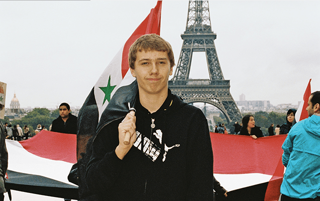 A cute kid named Florent shows his support for Bashar al-Assad. This is his second time protesting on behalf of the regime.