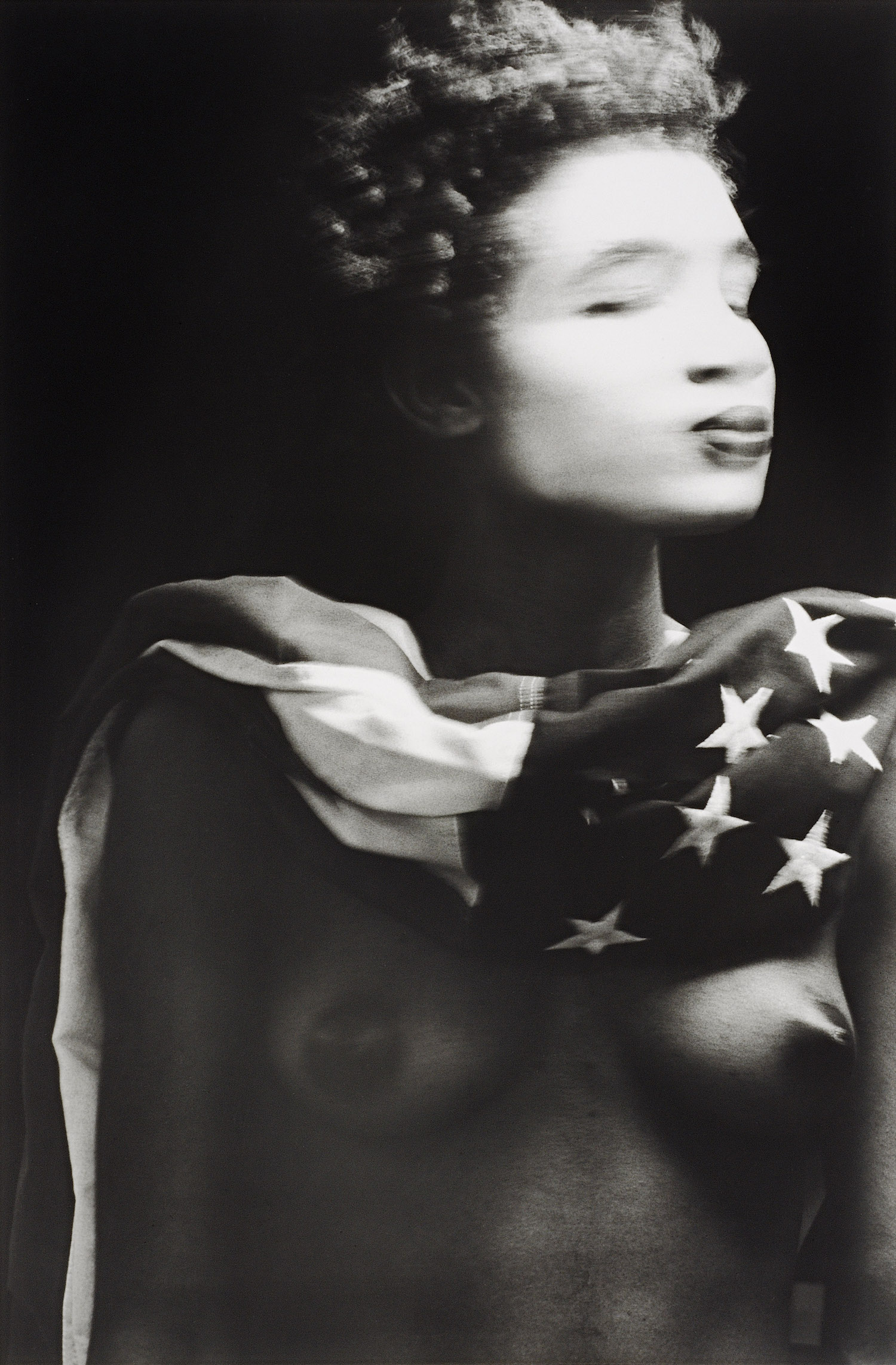 Horace Pippin’s 1944 oil painting, Abe Lincoln’s First Book, a part of CMOA’s collection, represents the genesis for the show. It depicts a young President Lincoln, shrouded in darkness, reaching for a book, a gesture that Hunt calls, “the perfect metaphor for how we are feeling about the current state of affairs.” In an era of fake news, where citizens don’t know what or who to believe, Pippin’s painting, made in Harlem, can be seen as a young man living in a republic at a crossroads, seeking knowledge and understanding. Abe Lincoln’s First Book is part of the first section of the show, “A More Perfect Union,” which is mounted near Jasper Johns’ Flag 1—a screen print of two American flags—and Lyle Ashton Harris’ Miss America photo—a nude woman in white face paint. “She wears the flag rather than waves,” notes Crosby to Hunt in a conversation in the exhibition’s slim gallery guide. “Queering the flag,” Hunt responds.