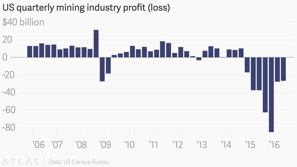 It’s hard to pity the oil industry.But the scope of the losses experienced by the US mining industry—which includes oil and gas drilling—is pretty impressive.Mining companies with more than $50 million in assets lost roughly $26.7 billion during the second quarter. (That’s March through June.)While not as steep a loss as the $37.4 billion that these companies lost during the second quarter of 2015, it’s just the latest in a series of giant gouts of red ink brought on by the sharp collapse of oil prices that started back in 2014.