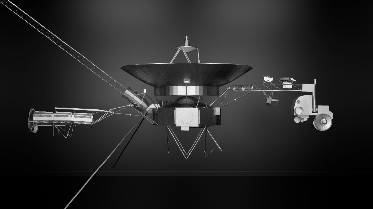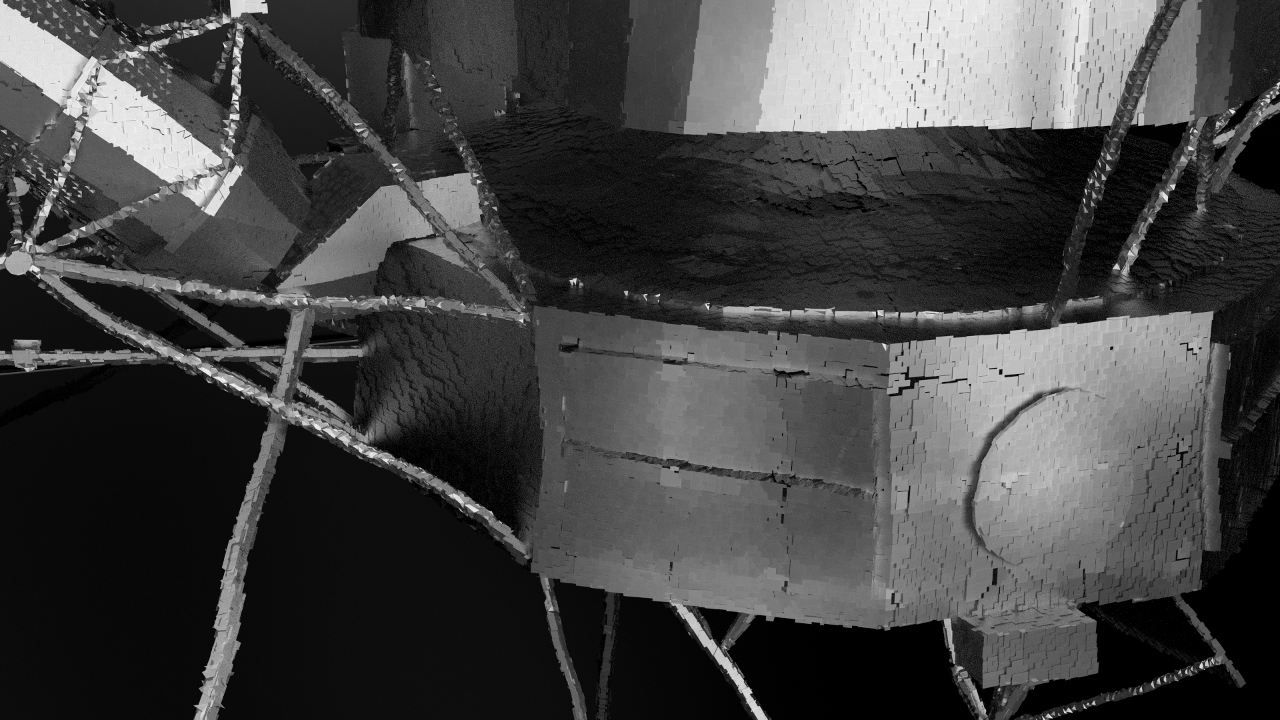 Now, how does the Voyager spacecraft in the exhibition fit into all this?Our interest in this one goes back to coming across a list of things that are believed to happen in the unimaginably far future. One of the things predicted is that in 1065 years’ time, solid objects will have rearranged their atoms and molecules via quantum tunnelling, because on that time-scale all matter is believed to flow like a liquid. The two Voyagers have just recently left our solar system, but they will keep racing through the void for a very, very, very long time, potentially forever. We created this simulation to visualize what would happen if they actually keep traveling eternally and would, under the influence of their own gravity, slowly liquify into a round metal object.