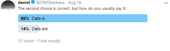 Solomon used the NOW corpus to look up what verbs are most likely to follow “data” and found that “is” is over seven times more likely to appear after “data” than “are,” so people reading the news are far more likely to encounter the allegedly ungrammatical use of “data” than the grammatically correct version. In short, the use of “data” has clearly changed in popular speech and it’s time to acknowledge that.
