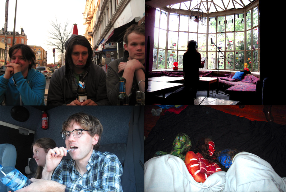 More outtakes from tour via the band, recording "100/0" in Germany in the top right.We talk about going on tour. We talk about what it's like to be both a fan of music and a musician. She tells me about traveling the world with six people. We talk about how they managed to record vocals in a hotel closet during Primavera Sound in 2010. She tells me about taking the same elevator as her idols. ("It's really crazy to be, like, riding the elevator with Pavement and the Pixies; you're just, like, eating in the same cafeteria as them!") We talk about the band recording the song "100/0 (Snowdays Forever)," from their 2010 album Autumn Again, in a crazy squat in Germany with beautiful acoustics. And despite these bursting developments, she manages to speak with a quiet confidence, somehow holding her excitement in."You're kind of in this womb when you're in the van. We have a really good time on tour and we used to think our lives on tour were pretty adorable," she says. "It was us taking care of each other and performing heartfelt music, then going to the next town and doing it all over again."In a world where the Internet can bring together strangers, friends, and lovers—it makes sense that it can do the same to bring together a band. But the people who make up A Sunny Day In Glasgow view themselves more than just six people who play music together; they call themselves a family. "The band is the tie, but we would all choose to be around each other," she says, which doesn't sound too different than most of families in the world.Kayla Monetta is scribbling in her mural cosmic journal. She's on Twitter — @kaylamomo--Want more chill chats with chill bands? Check these out:In a Sunny Daze with the DonkeysDrunk in Love with Sharon van EttenFrankie Cosmos Is Here to Show You Her Own Universe