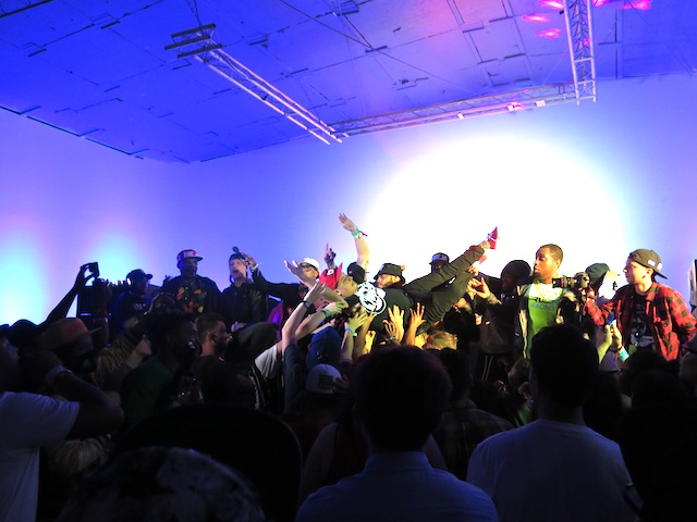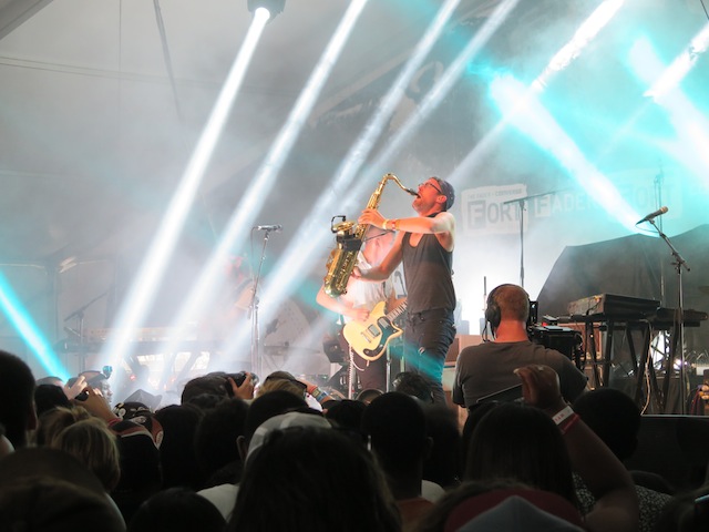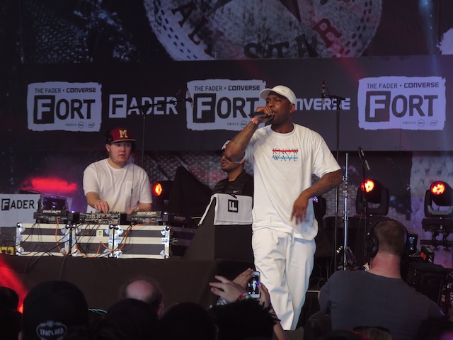 Slightly later, incongruously sandwiched between Ghostface and Fader Fort headliner, Mike Will and his celebu-music cast of guest stars, is Bleachers. In the past 12 months Jack Antonoff has become so much more than just the guitarist in fun. He’s the frontman of Bleachers, he’s selling out tours, he’s co-writing with Taylor Swift, he’s Mr. Lena Dunham, he’s got a motherfucking sax player who gets on his goddamn knees and blows like he means it—now there’s an image—and he does. Bleachers mean it in the most brilliantly, unabashedly uncool way. Antonoff has got his guns out tonight and he’s fist-pumping and gesticulating, there’s a flashy light show and dry ice, and all of it is the pitch perfect accompaniment to songs that bluster like Bruce, but pack the rousing, jittery energy of peak-era Killers. I really didn’t expect to like Bleachers, but they won me over even before the keyboardist busted out a sax and started raising his brass to high heaven.