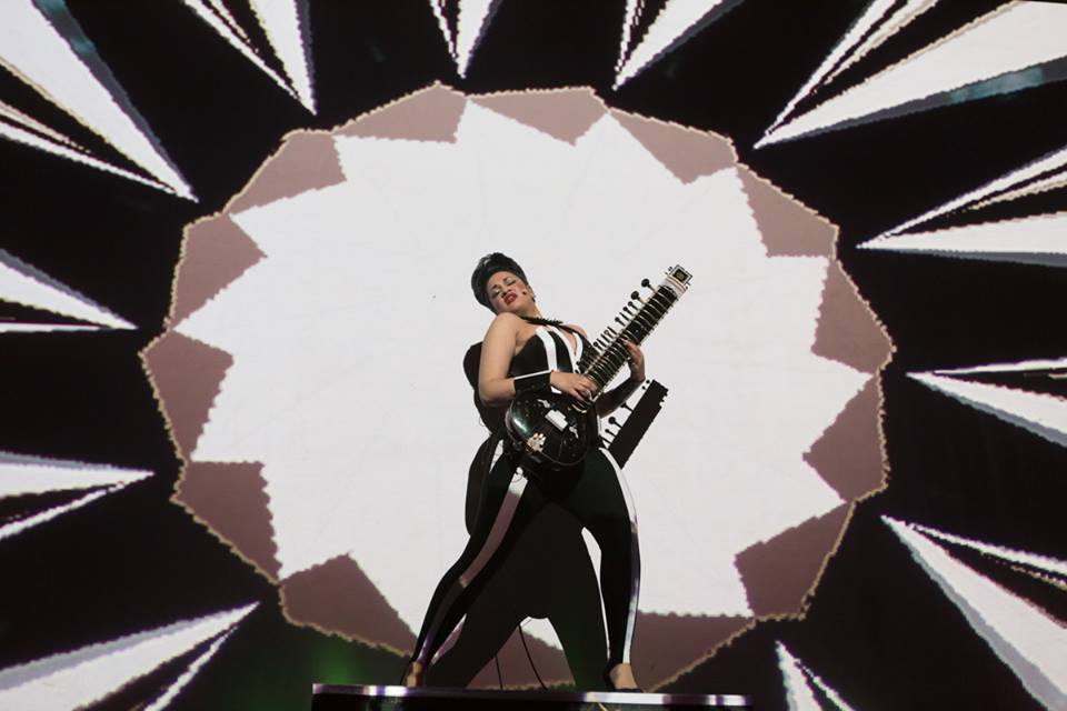 Bishi live at the British Film Institute in London.When I first received an invite to Bishi’s Albion Voice album performance, I thought I was going to attend a straightforward concert, but then when I arrived at The Kitchen—a center for video, music, dance, performance, film, and literature in New York City—I berated myself for not reading the email properly and panicked because I thought we were in for an evening of performance art. This always terrifies me because I assume I won’t get it and instead I’ll spend 75 uncomfortable minutes not understanding how I am meant to be feeling. But Bish's show turned out to be neither and both all at once and it was REALLY, REALLY GOOD.Bishi is a pop star who also knows how to play every instrument on the planet and sing in a billion (at least four) different languages, while simultaneously communicating a thought-provoking message about identity and non-conformity in a city (London) that claims to embrace multiculturalism.This all unfolds while she performs in sync with a set of mindblowing visuals projected on the screen behind her. Bishi does this with such awe-inspiring accuracy that even Yoncé would be jealz. Additionally, she does all this while balanced atop sky-scraping heels, undergoing several costume changes, and shifting seamlessly from standing under the spotlight enveloped in a white wedding shroud, to dropping it low in a catsuit playing a rock sitar.I wanted to know more about this brilliant creature, so I met up with Bishi a few days after her show to talk about the inside of her mind, digi-diarrhea, sitar-blasphemy, and why falling off the stage is fucking fierce.
