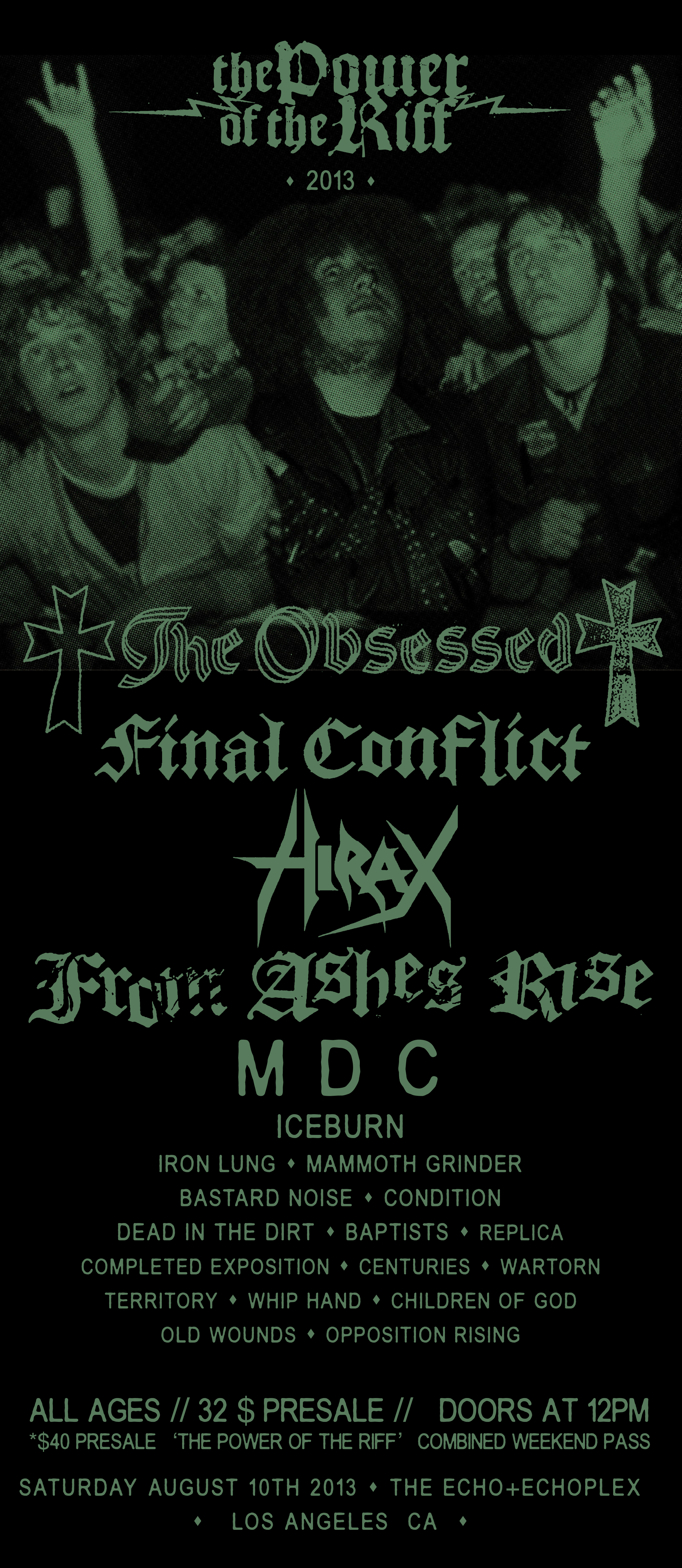 Metalheads of Los Angeles: In case you haven’t heard, the fourth annual Power of The Riff festival is this weekend. Whether you like hardcore, doom-metal, sludge-metal, or you’re just into brutal shit in general – this is what you’ve been waiting for. We’re giving away a pair of tickets to both the pre-show party on Friday, August 8th and the all-day, all ages festival on Saturday, August 9th.The festival will take place this Saturday at 12pm in both The Echo and its downstairs counterpart, The Echoplex and it's all ages so bring your friends, little sister, older brother, newborn, neighbor, cousin, enemy, mom, grandpa, spirit animal, invisible friends, and guardian angel, because metal hath no form (but The Echo does have health and safety codes to follow, so don't even think about bringing your illegal pet ferret, buddy).What's even better is you can win a pair of tickets to both the Pre-Show party as well as the festival proper by emailing us the most metal name you can think of to !Tickets for the Pre-Show Party w/ Black Breath (18+) $12 presale $40 doorTickets for Power of The Riff w/ The Obsessed (all ages) $32 presale $40 doorBuy your tickets here.
