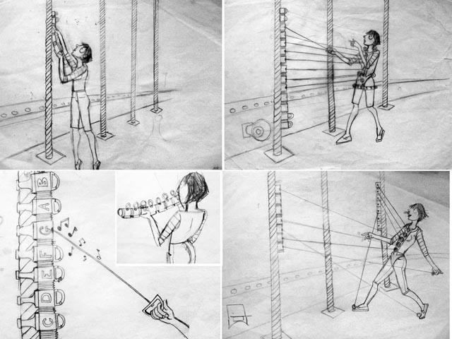 Sketches of the "Human Harp"From there anyone will be able to download the patent for it, learn the coding and everything else, and help take the project in new directions. "That might be how can we make the module more sustainable or how can we make it more intuitive for a dancer or a pedestrian." notes Mainstone.
