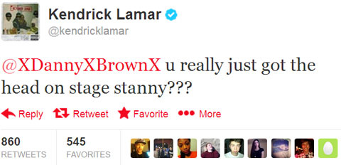 At the moment, I’m on tour with Danny Brown. This means that in between hours of watching dudes smoking weed, I’ve had some time to start cultivating the sociological theories that will be the cornerstone of the book I’m writing on the weird and unexpected shit rappers do. We haven’t been on the road for a week yet, but I’ve already got reams of material. This past Friday, in Minneapolis, the tour made some waves when a female fan pulled Danny’s pants down in the middle of the show and started performing oral sex on him. The internet thought this was a big deal, so there are articles here, here, and here, mostly harping on the fact that Kendrick Lamar tweeted at Danny after he heard about the deed: